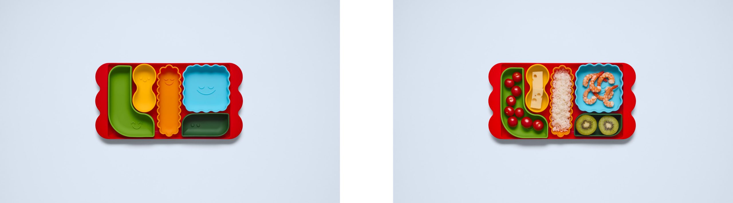 Pour que le message passe, il fallait sortir du discours médical. L’enseigne a donc misé sur le visuel et le design. Le dispositif repose sur une mécanique ludique : 6 boîtes bentos colorées. Conçues en collaboration avec la product designer Clémence Germain, ces boîtes ne sont pas de simples contenants. Elles reprennent les codes graphiques des halles de produits frais (boucherie, primeur, poissonnerie) et guident l’enfant dans la construction de son repas.