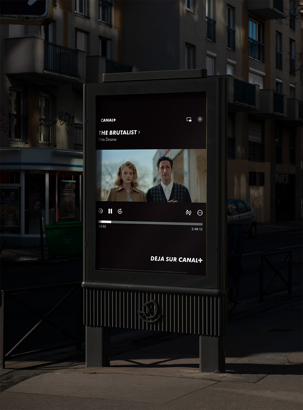 Oubliez les affiches de cinéma classiques avec le titre en gros et les crédits en bas. Ici, BETC nous plonge littéralement dans l’interface de l’application myCANAL. Les visuels sont des arrêts sur image, figés en pleine action, avec la barre de lecture apparente, le timecode et ce fameux bouton « Pause » en plein milieu. En voyant ces images en format géant ou en DOOH (affichage numérique), notre cerveau de spectateur est piégé. On a le réflexe instinctif de vouloir appuyer sur « Play ». C’est une frustration positive savamment orchestrée : on ne nous montre pas juste une image, on nous présente un contenu prêt à être consommé.