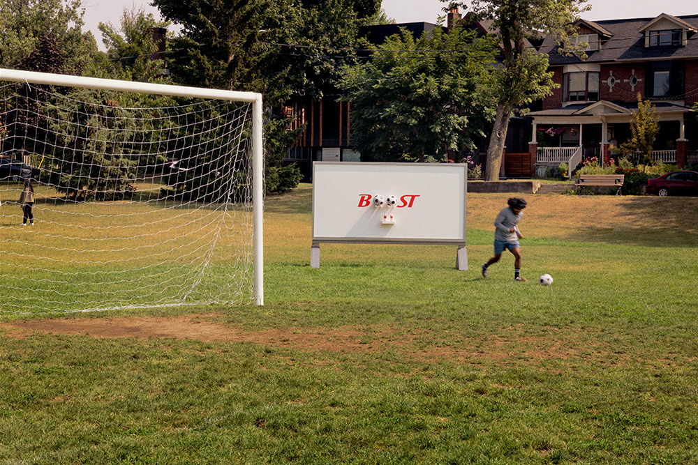 Pour cette campagne signée Courage, l’agence créative de BOOST au Canada, la marque a décidé de transformer ses affiches en véritables outils d’activation physique. Dans la rue, les deux “O” de son logo ont été remplacés par des vélos fixes installés directement sur les panneaux. Dans les salles de sport, on a vu apparaître des poids à soulever griffés BOOST. Et sur les terrains de foot, des ballons en libre-service attendaient les passants.