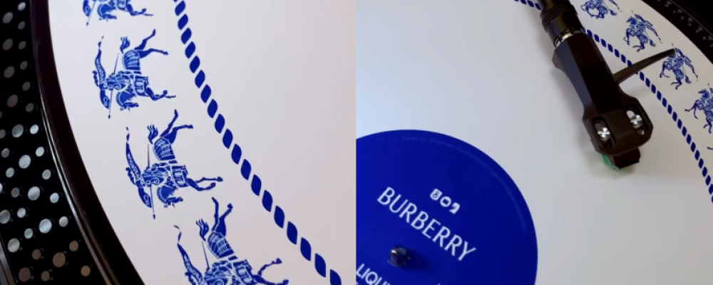 Le premier disque reprend le motif emblématique à carreaux de Burberry, dans une version beige, orange et noire qui prend littéralement vie une fois le vinyle lancé sur la platine. L’effet d’illusion d’optique créé par l’artiste Drew Tetz transforme le simple motif en animation visuelle magnétique, subtile et élégante. Le second vinyle, lui, revisite le célèbre Chevalier Équestre, logo de la marque, dans une version stylisée en blanc et bleu qui évoque les prémices du cinéma d’animation, et notamment les expériences photographiques de Muybridge en 1878.