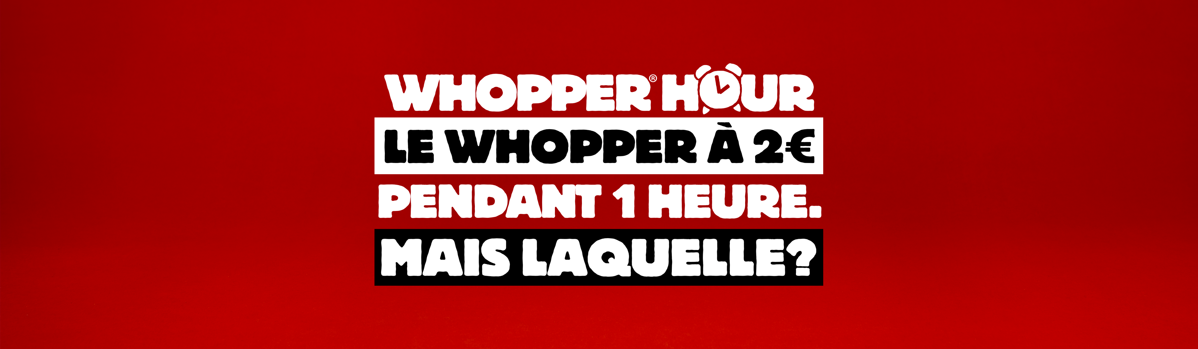 Chaque jour, pendant une semaine, l’enseigne lance l’heure de la “Whopper Hour” : un Happy Hour durant lequel vous pourrez profiter de votre Whopper pour la modique somme de 2 euros. Pendant une heure, mais laquelle ? Pour vous tenir en haleine jusqu’au bout, le rendez-vous fatidique sera différent d’un jour à l’autre et ne sera révélé qu’au dernier moment. Attention ! Après l’heure, c’est plus la Whopper Hour !