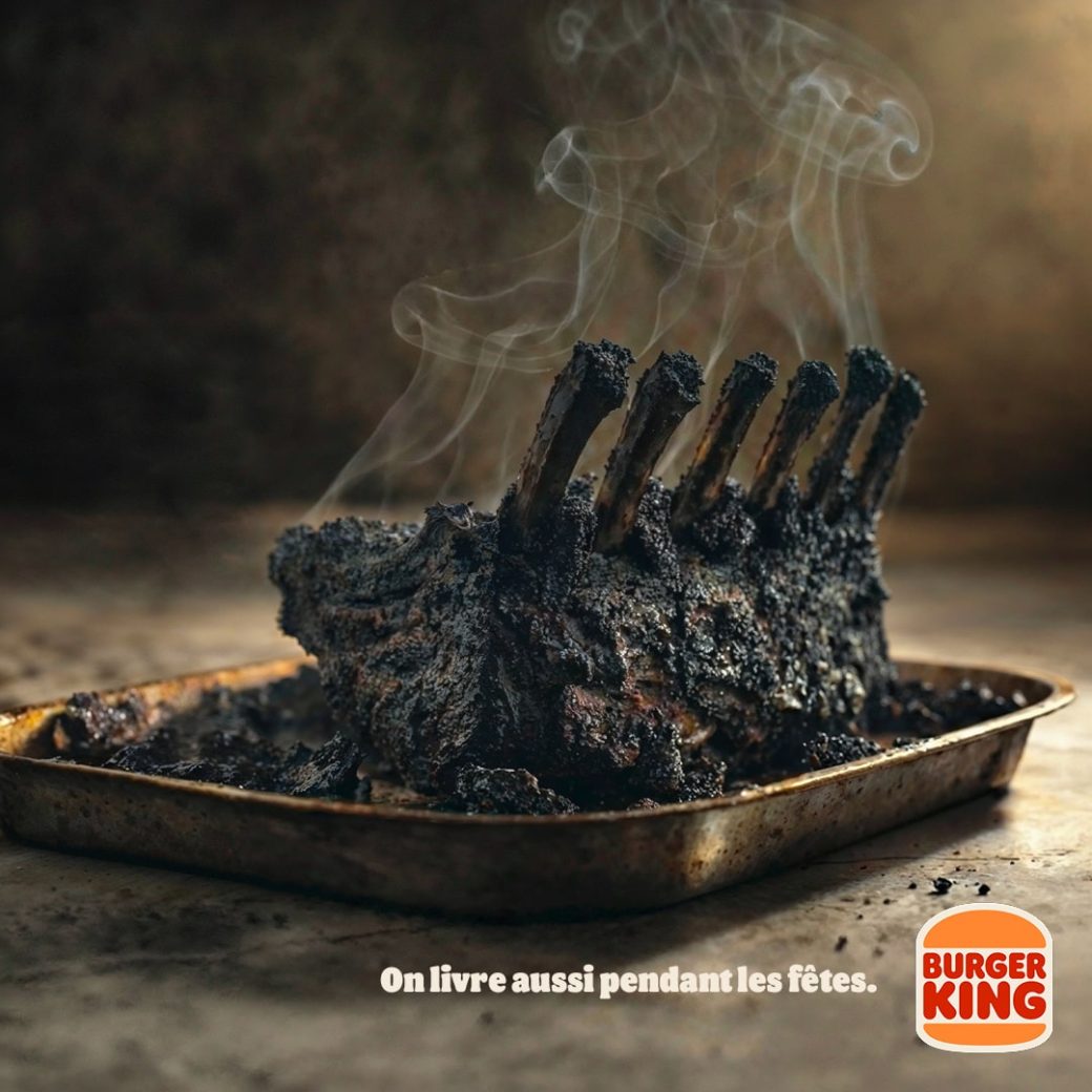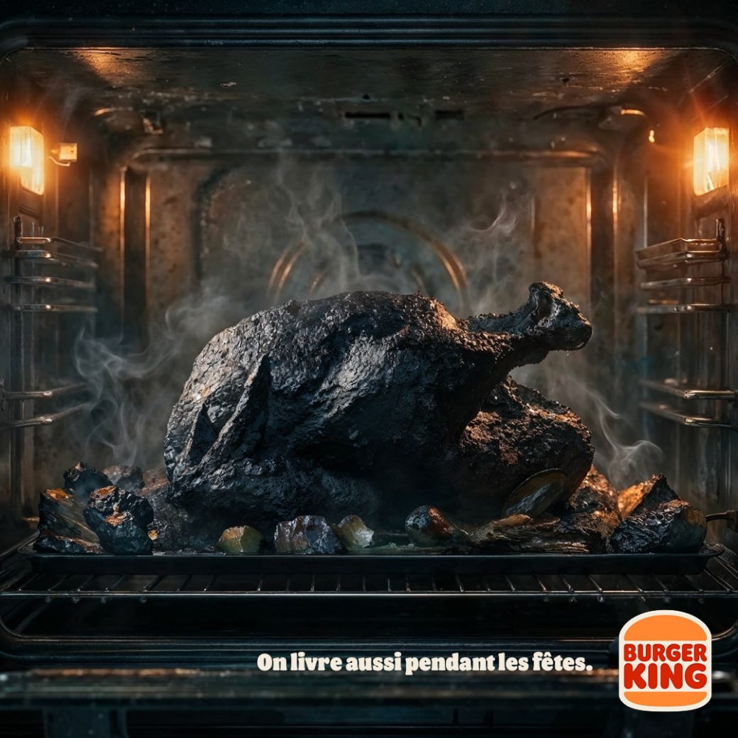 Alors que la plupart des marques nous inondent de publicités féeriques, de familles modèles et de plats qui semblent sortir d’un magazine gastronomique, Burger King choisit l’honnêteté brutale. La marque dévoile une série de visuels qui sentent le vécu : une dinde complètement carbonisée, noire comme du charbon, ou un poisson tellement méconnaissable qu’il en devient une œuvre d’art abstraite.