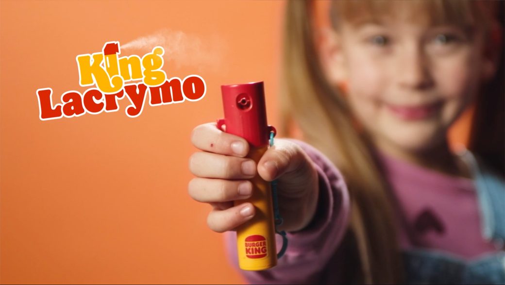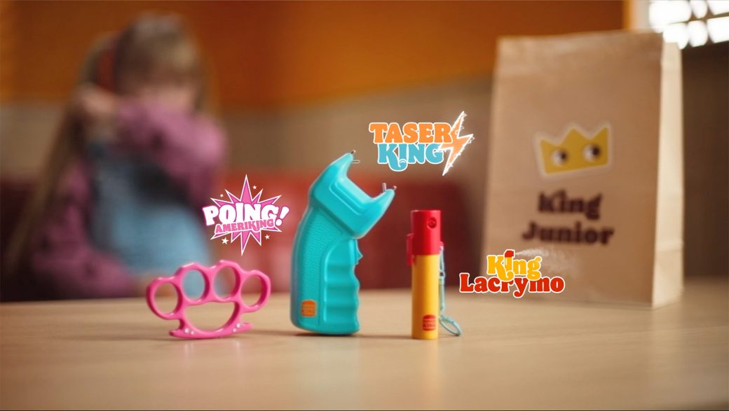 On découvre un enfant, sourire aux lèvres, en train d’ouvrir son menu King Junior. Tout semble normal : frites, nuggets, boisson… jusqu’à ce que le ton bascule. Le garçon y découvre alors une bombe lacrymogène, un taser et un poing américain. Un contraste violent, glaçant et terriblement efficace.
