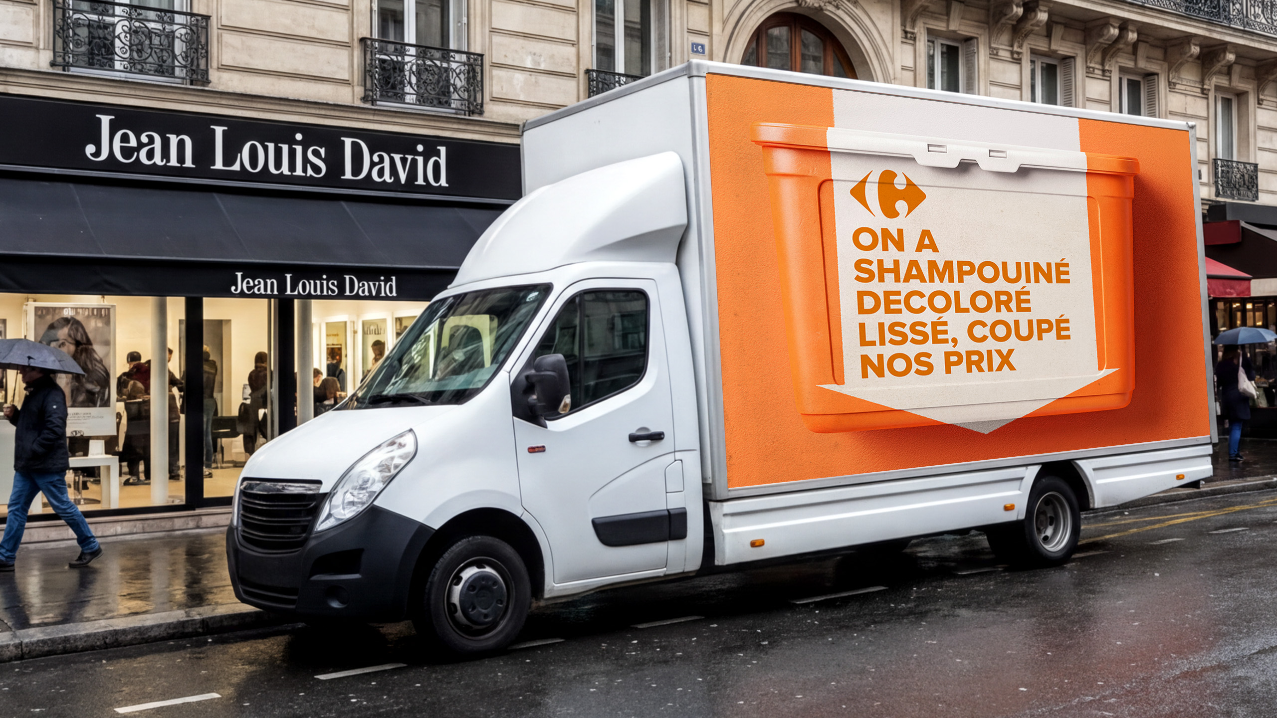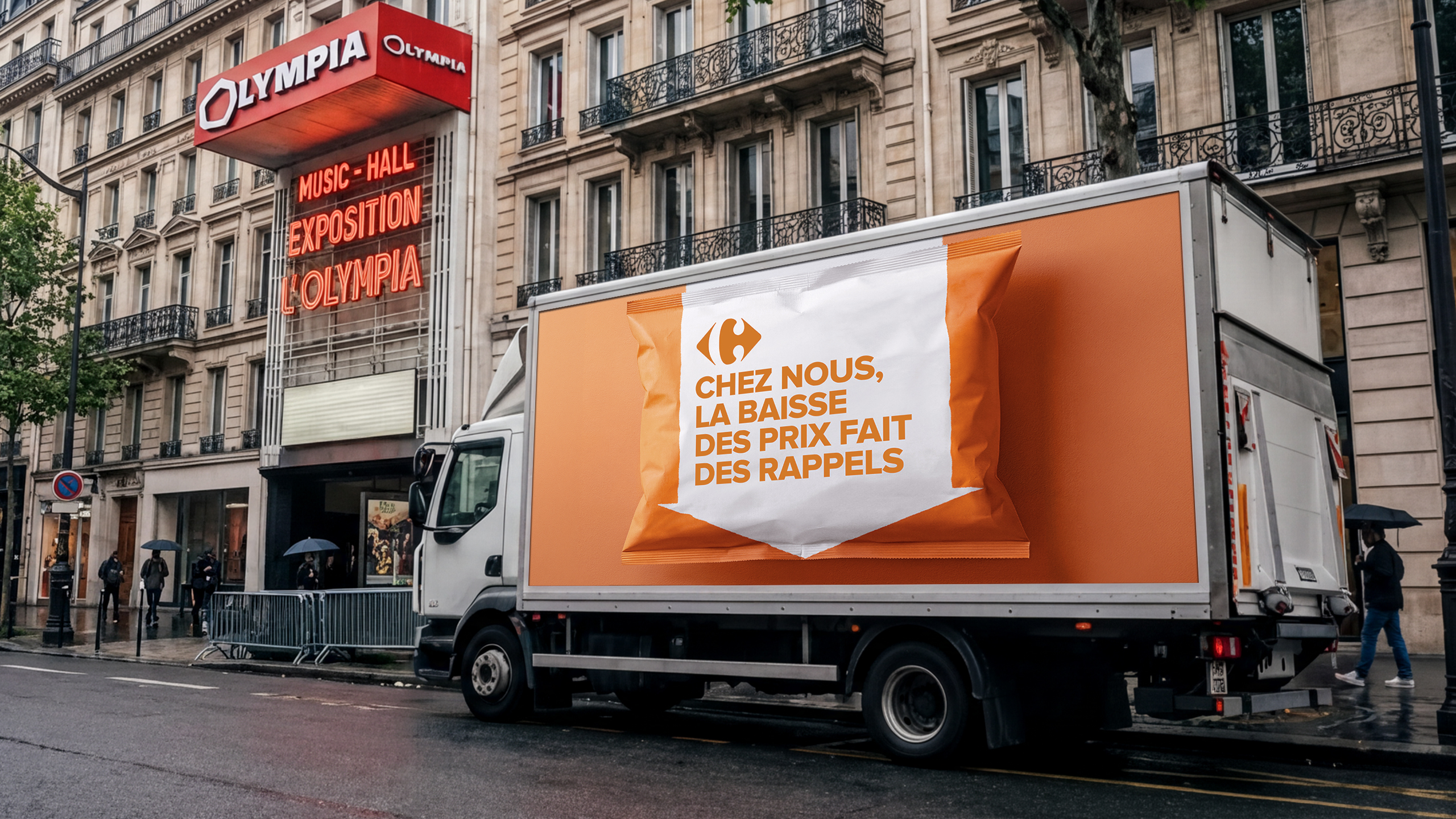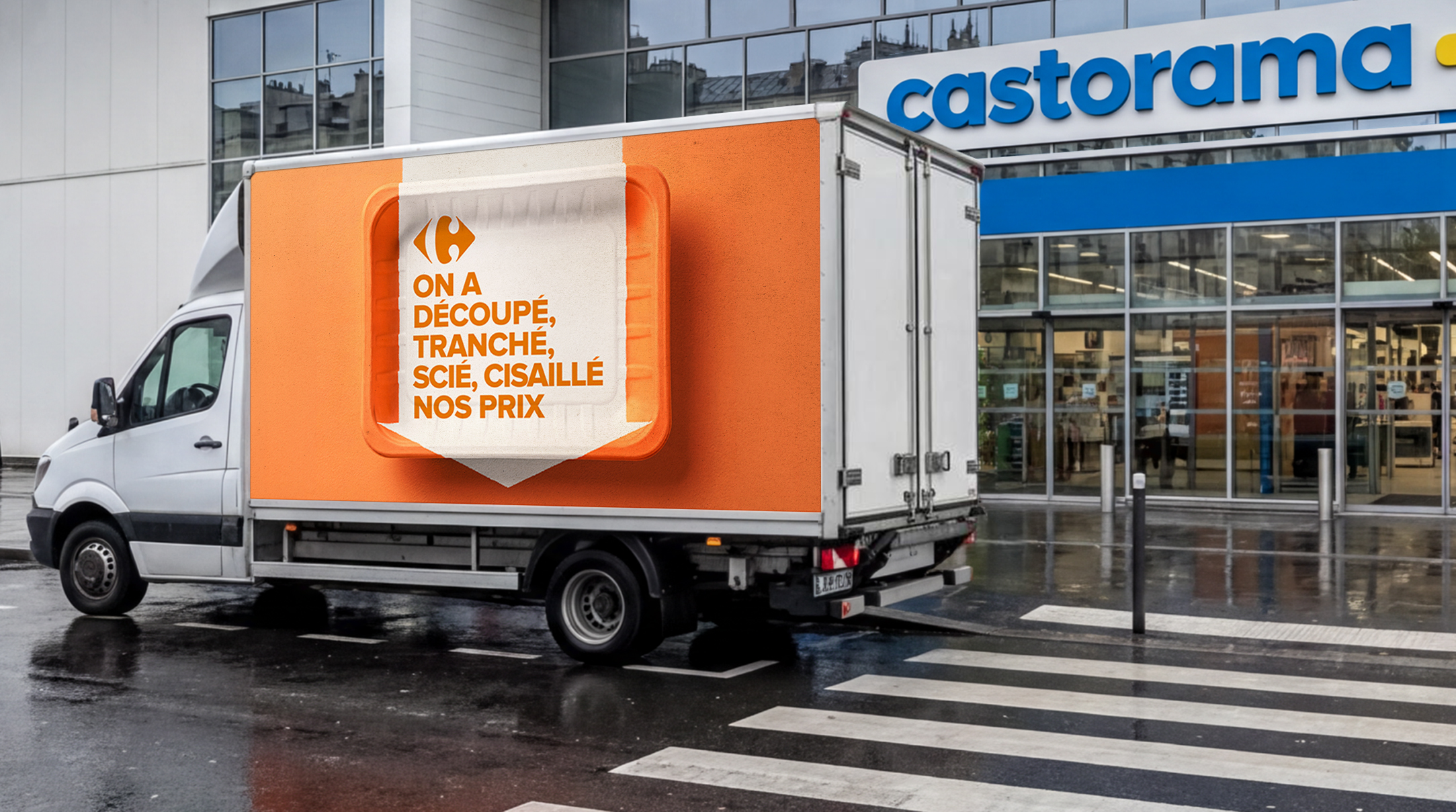 Le cœur de cette opération événementielle repose sur un concept malin : l’affichage mobile ciblé. Plutôt que de louer des panneaux 4×3 classiques, Carrefour utilise ses propres camions comme des chevaux de Troie publicitaires. Chaque vanne est taillée sur mesure selon l’endroit où le véhicule est stationné.