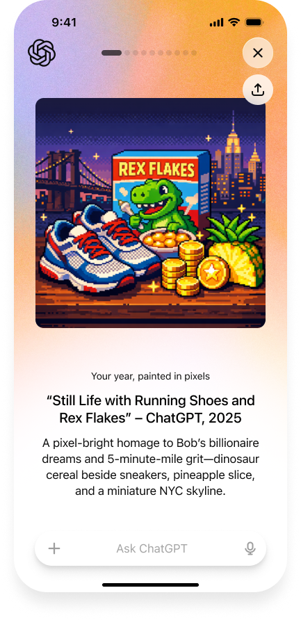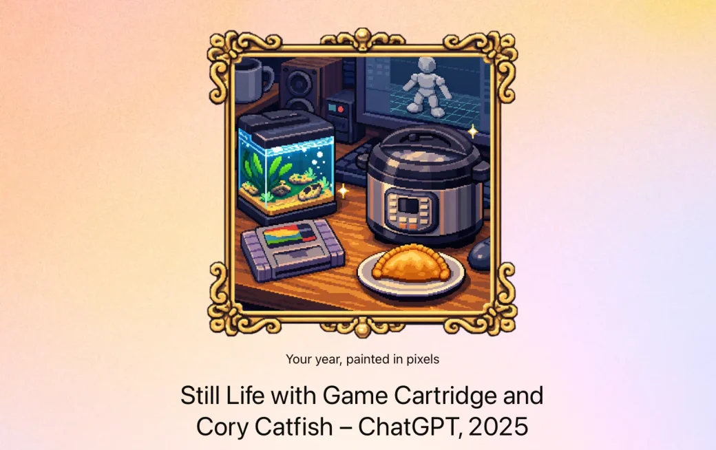 Plutôt que de simplement vous dire « vous avez envoyé 500 messages », ChatGPT génère une image personnalisée en pixel art. Ce visuel unique résume graphiquement vos centres d’intérêt de l’année. Vous avez passé 2025 à demander des recettes de cuisine et des conseils pour votre aquarium ? Votre image affichera un autocuiseur à côté d’un bocal à poissons. Vous êtes fan de retrogaming ? Une cartouche de jeu apparaîtra dans votre fresque numérique.