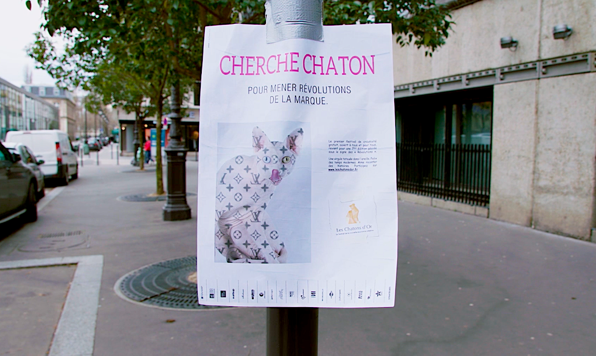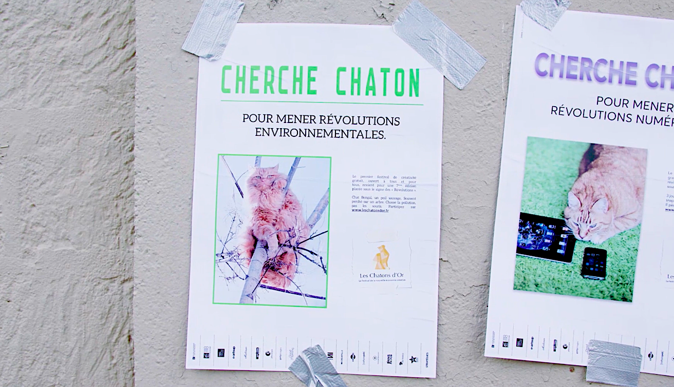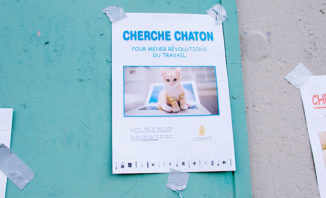 L’idée pour trouver l’idée de la campagne : rassembler anciens Chatons d’Or et anciens jurys autour d’un brainstorming par équipe. Le résultat de l’expérience : « Cherche Chaton », des avis de recherche affichés dans la rue en guérilla marketing. Comme la mère Michel qui a perdu son chat. Les avis de recherche seront ensuite diffusés sur les réseaux sociaux (Facebook, Twitter, Instagram), dans le métro avec Métrobus, dans la presse et en digital chez nos partenaires médias.