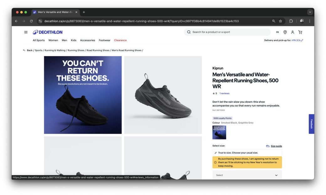 Concrètement, l’opération se déroule du 1er au 31 janvier 2026. Elle concerne un modèle best-seller bien précis : les chaussures de running KIPRUN 500 WR. Le parcours d’achat a été modifié pour l’occasion. Au moment de mettre l’article dans le panier, sur le site ou en magasin, le client fait face à un avertissement clair. En achetant cette paire, il renonce symboliquement et techniquement à son droit de rétractation.