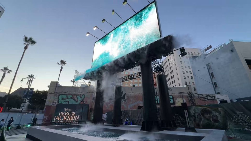 C’est à l’intersection mythique de Hollywood & Vine, un des carrefours les plus fréquentés de la ville, que la magie opère depuis quelques jours. Oubliez les simples écrans LED ou les toiles tendues. Pour promouvoir Percy Jackson and the Olympians, l’équipe marketing a construit un véritable réservoir d’eau vertical.