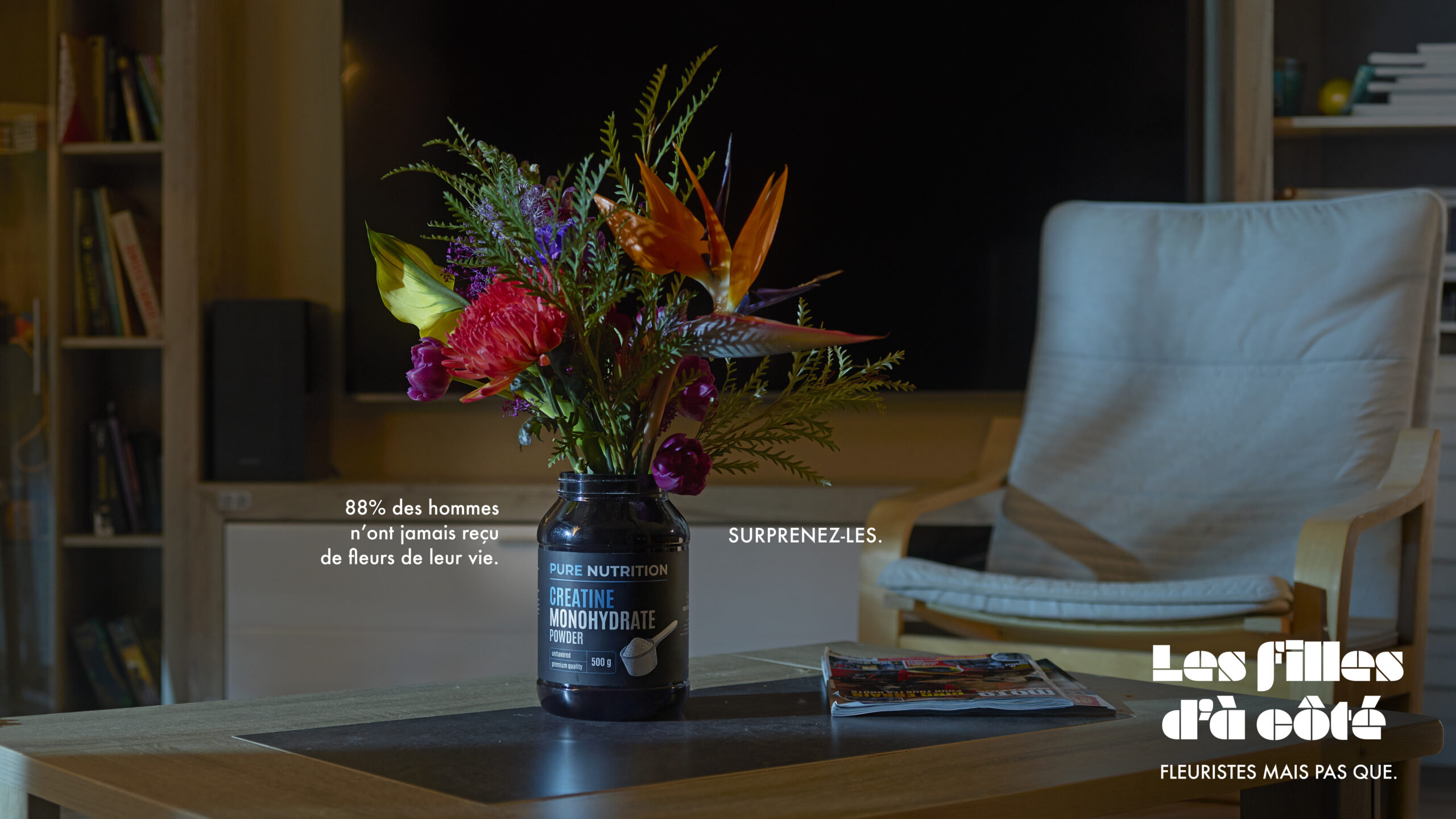 L’idée créative repose sur un insight d’une simplicité désarmante. Puisque les hommes ne sont pas habitués à recevoir des fleurs, ils ne possèdent généralement pas de vase chez eux. Alors, on improvise. Sous l’œil du photographe Samuel Guigues, les compositions florales s’invitent là où on ne les attend pas.