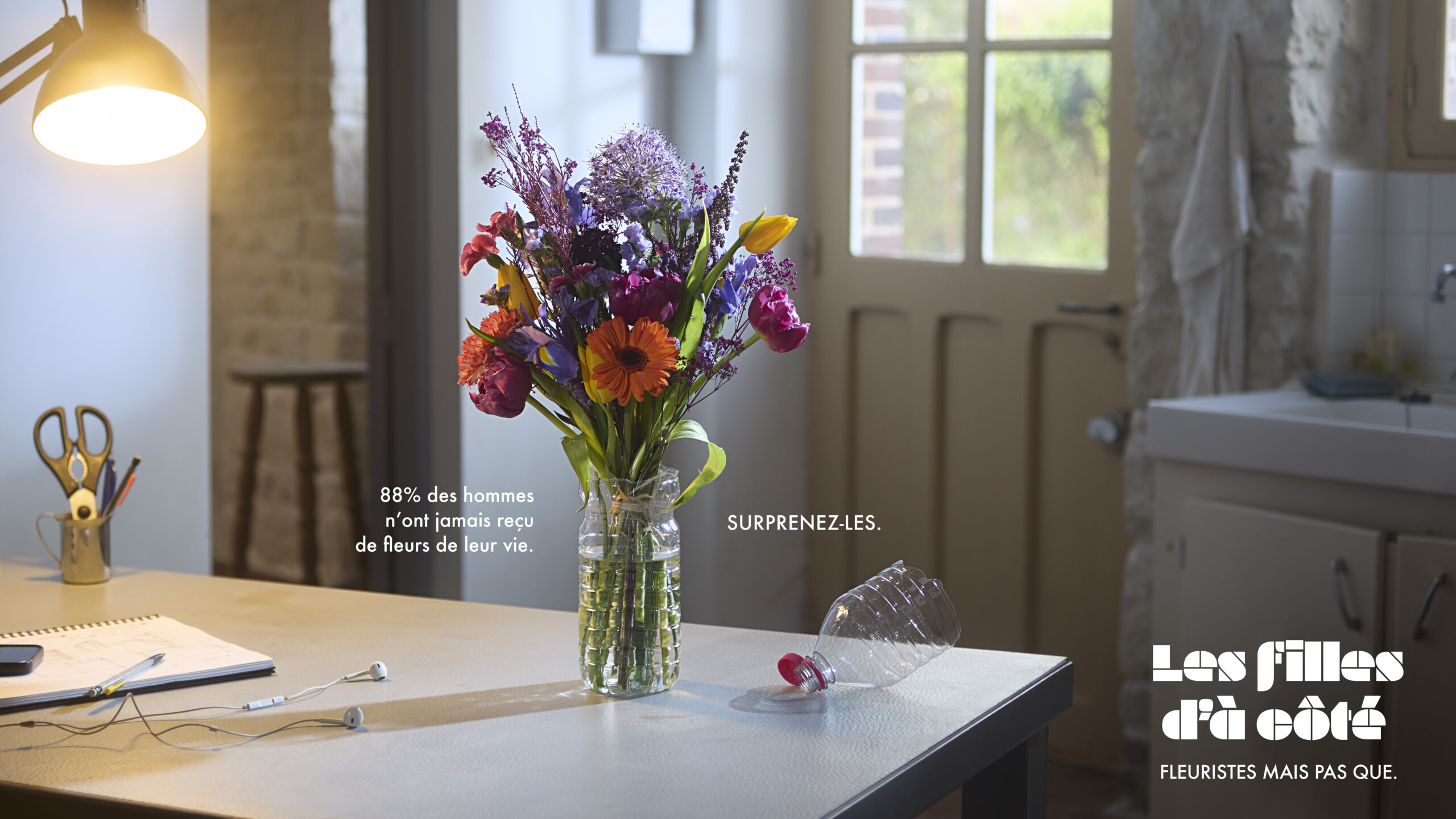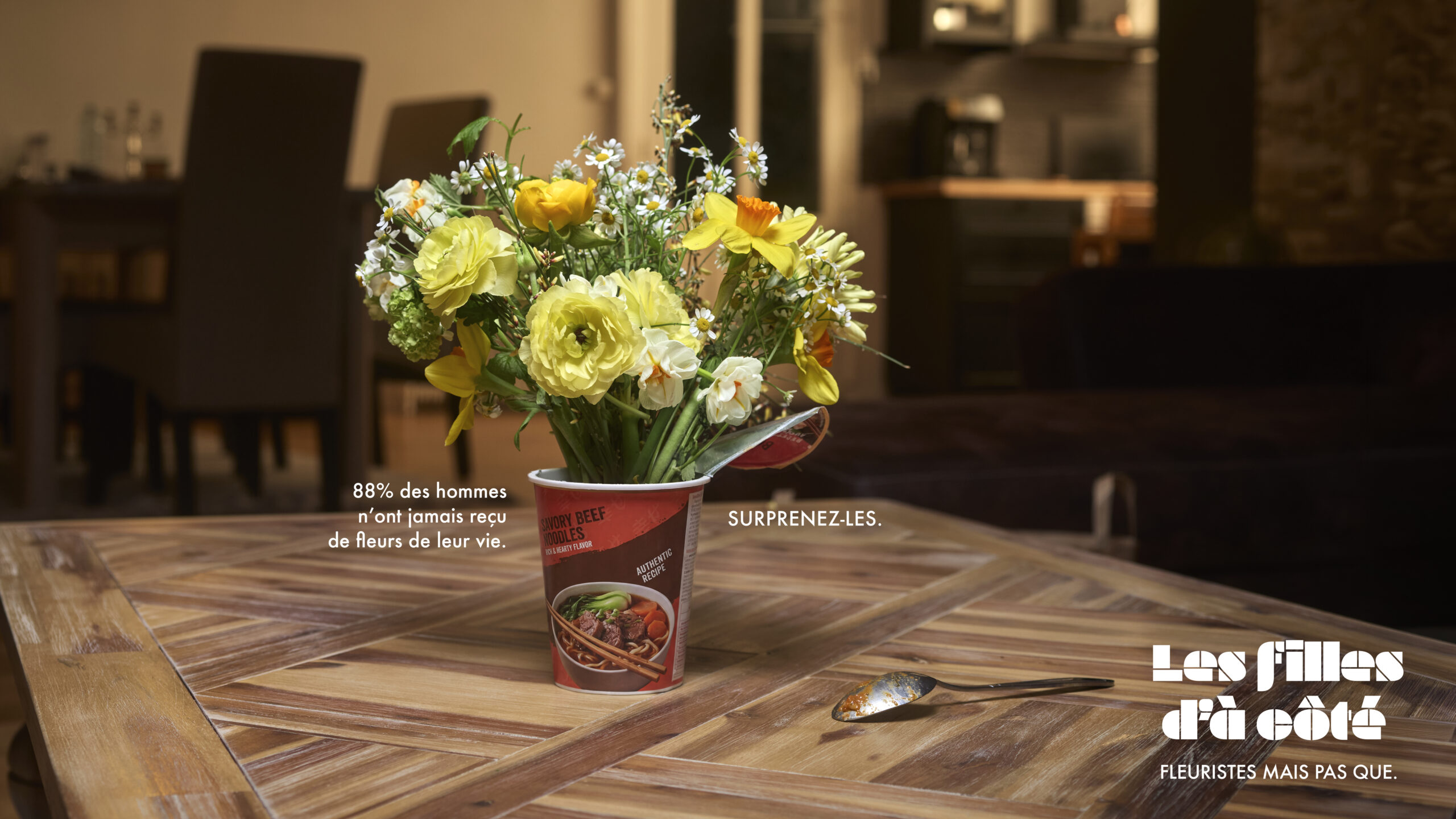 Au-delà de la plaisanterie visuelle, la campagne cherche à normaliser un geste encore trop rare. En montrant ces fleurs trônant fièrement sur une table ou un bureau dans des récipients de fortune, McCann Paris célèbre une masculinité qui s’assume. Il n’y a pas besoin de cristal ou de porcelaine pour apprécier la beauté d’un bouquet.