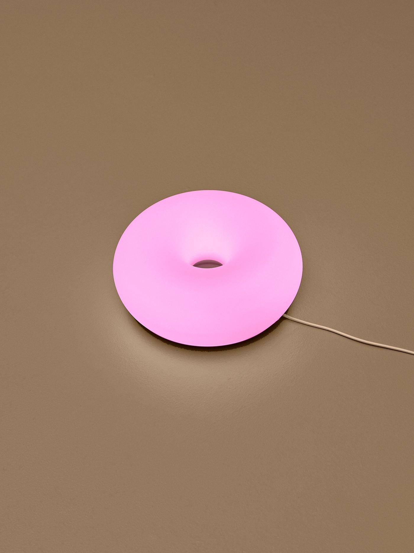 La nouvelle version de la lampe donut arbore une finition en verre blanc mat, givré et doux. Selon la designeuse, c’est une « évolution technique naturelle » : là où le modèle original jouait avec les reflets, celui-ci permet à la lumière de rayonner de l’intérieur, créant un halo beaucoup plus diffus et organique.