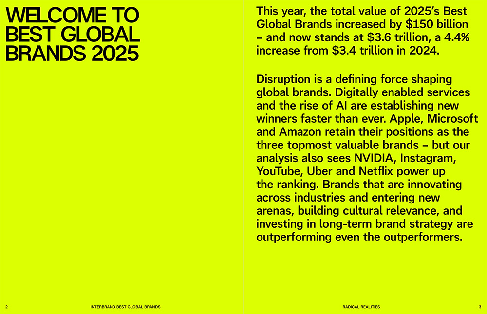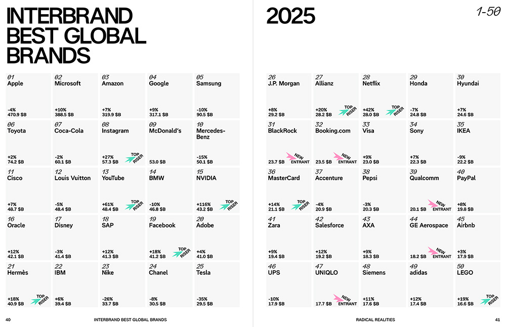 Cette nouvelle édition, intitulée “Radical Realities”, évalue la valeur totale des 100 marques les plus puissantes du monde à 3 600 milliards de dollars, soit 150 milliards de plus qu’en 2024. Mais derrière ce chiffre record, c’est une transformation profonde du rôle des marques qui se joue.