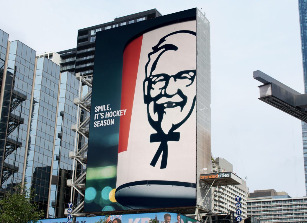 Cette proximité se traduit aussi dans l’exécution : les fans eux-mêmes, dans les spots, noircissent les dents du Colonel sur les affiches ou les seaux de poulet. L’idée s’étend ensuite à tous les points de contact : signalétique en magasin, packaging, panneaux d’affichage, réseaux sociaux, écrans géants dans les arénas, et même les bandes publicitaires autour de la glace.