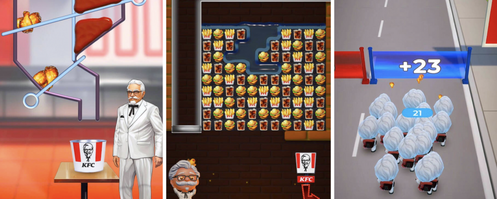En parallèle, des placements publicitaires malins ciblent directement les joueurs exposés aux fausses pubs. Cette fois, les pubs KFC ne mentent pas : elles renvoient vers de vrais jeux téléchargeables, disponibles dès maintenant sur l’App Store et Google Play.