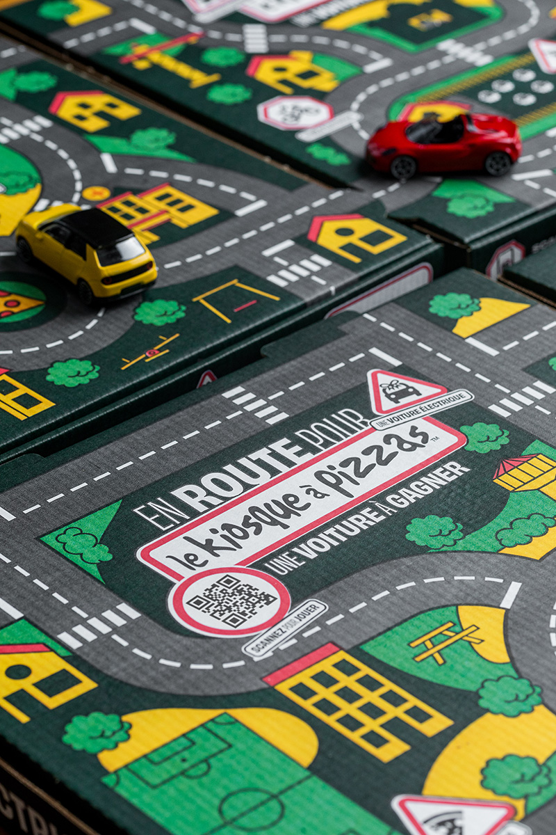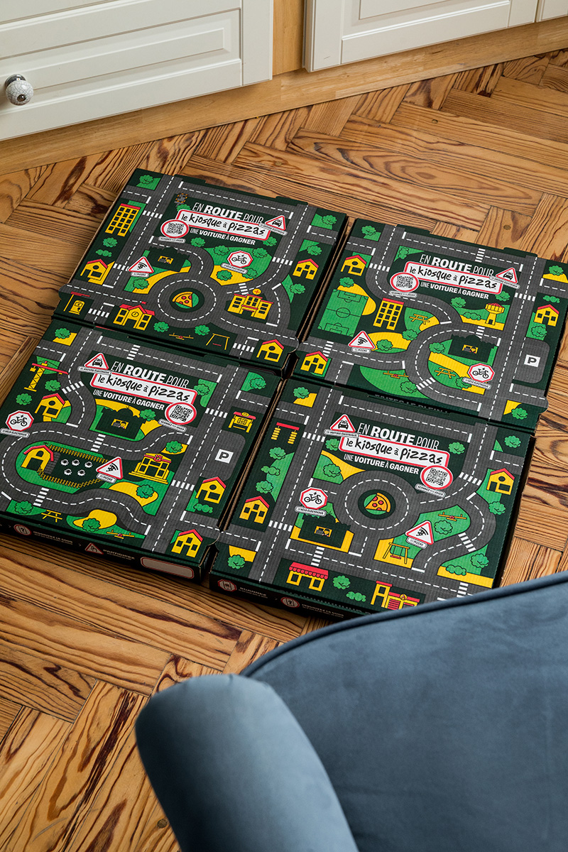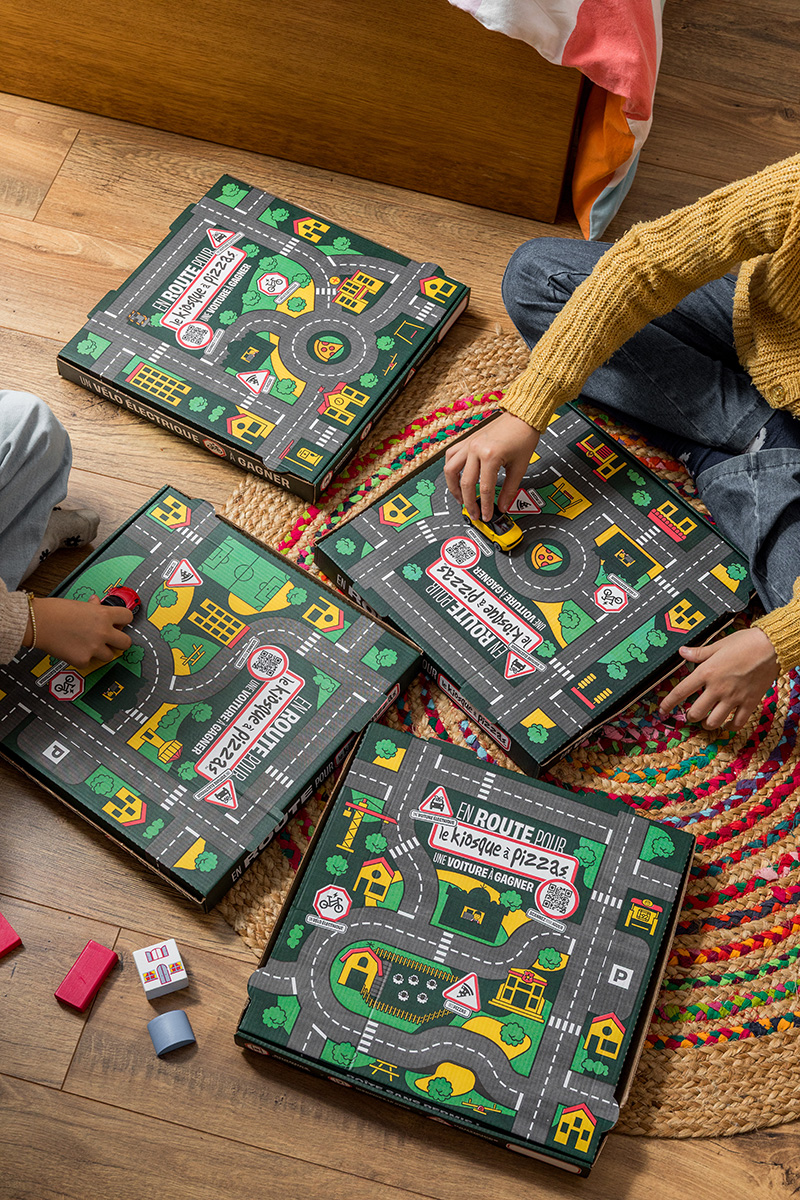 Imaginée par l’agence Le Vestiaire, qui accompagne l’enseigne dans sa stratégie globale, cette campagne repose sur un détournement aussi simple qu’efficace. Le dessus des boîtes à pizzas a été redessiné pour représenter des routes, des ronds-points et des paysages urbains.