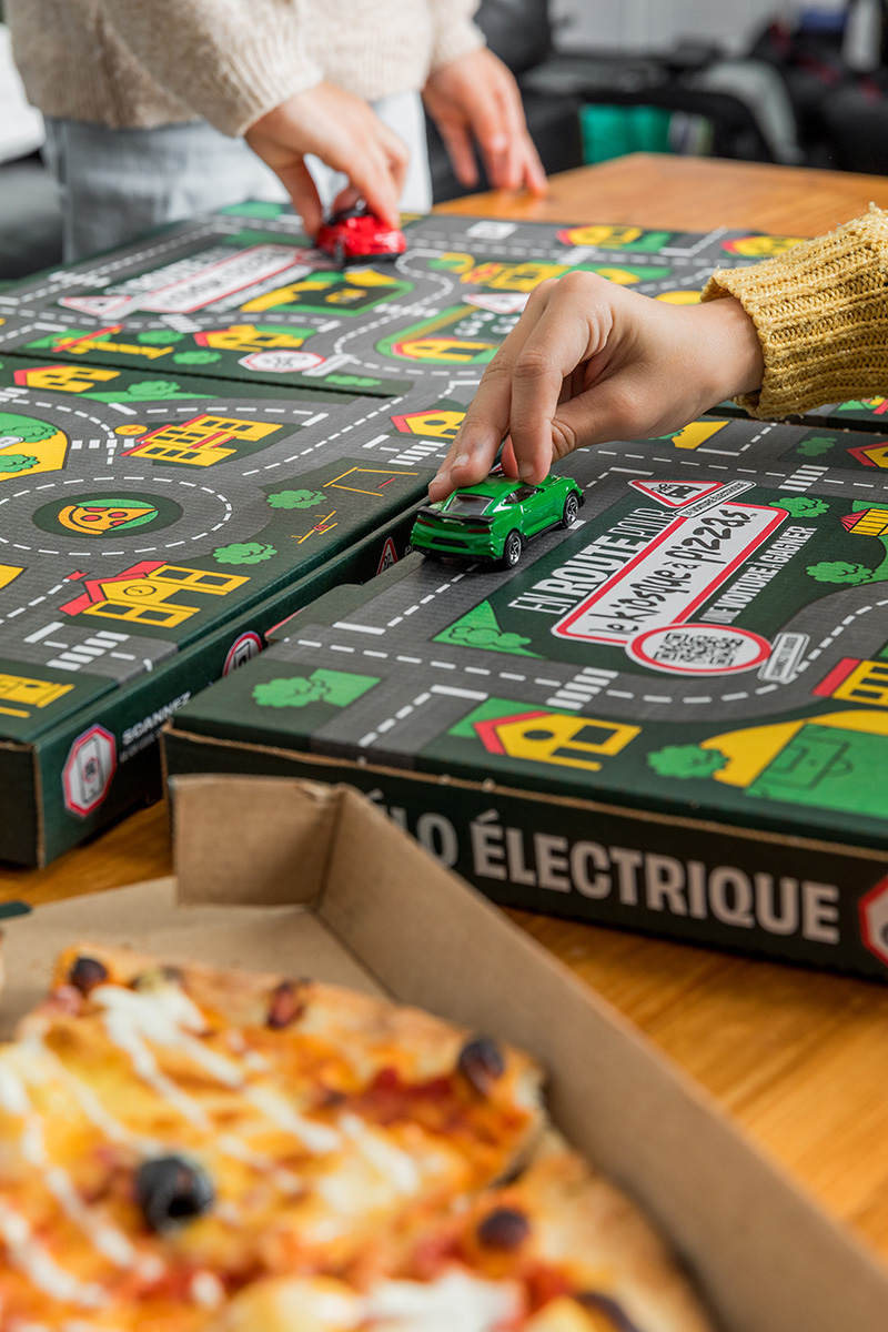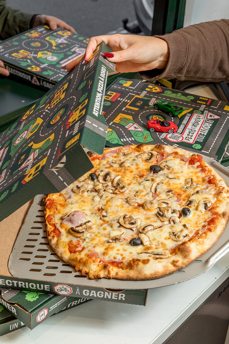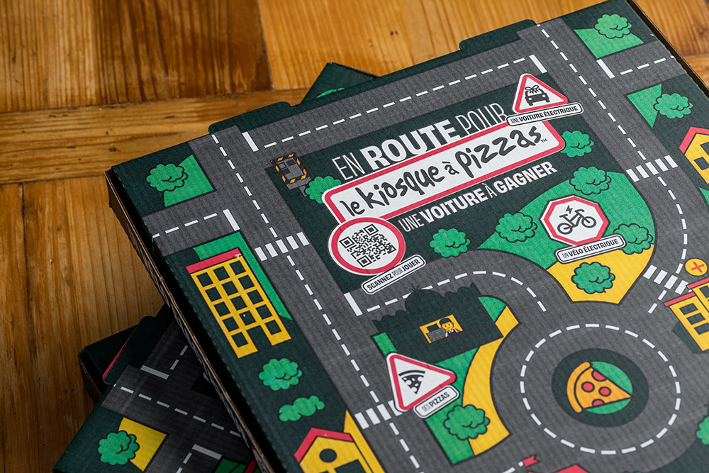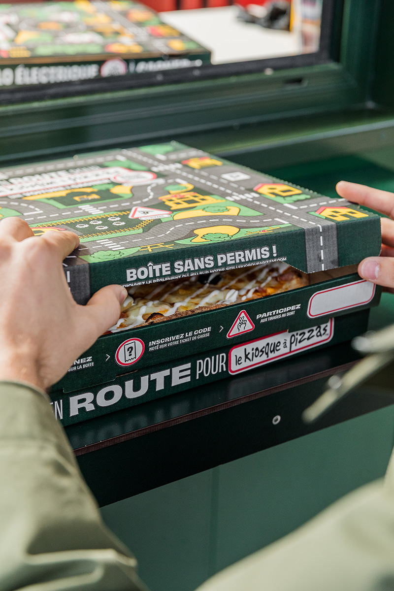 Imaginée par l’agence Le Vestiaire, qui accompagne l’enseigne dans sa stratégie globale, cette campagne repose sur un détournement aussi simple qu’efficace. Le dessus des boîtes à pizzas a été redessiné pour représenter des routes, des ronds-points et des paysages urbains.