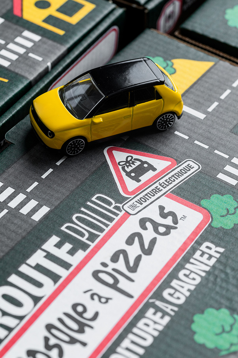 Il y a une cohérence globale intéressante : on joue avec des voitures sur le carton, et on tente de gagner une vraie voiture pour venir chercher ses prochaines pizzas.