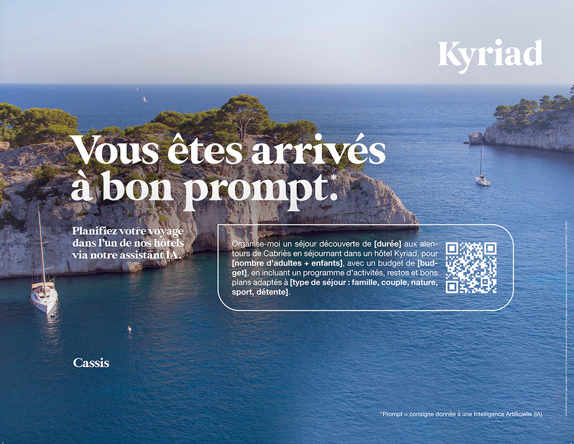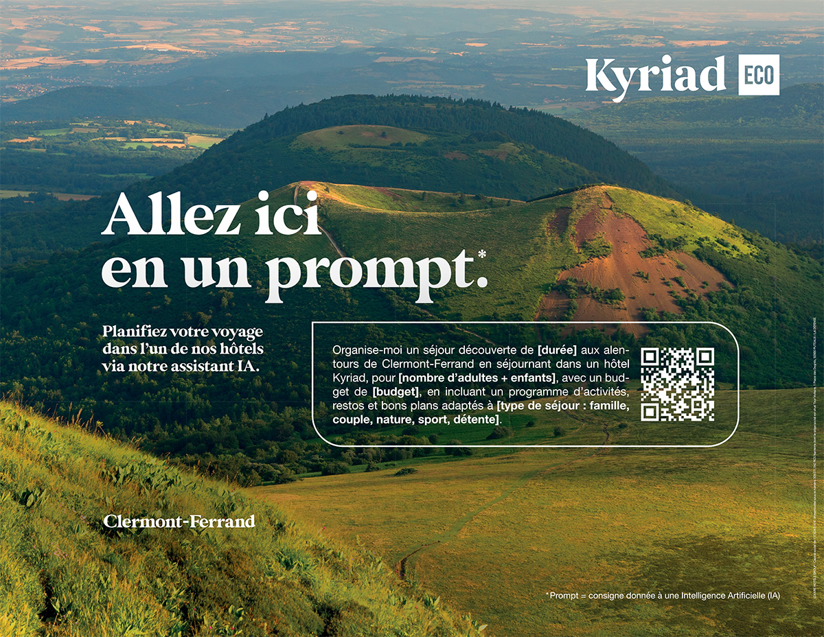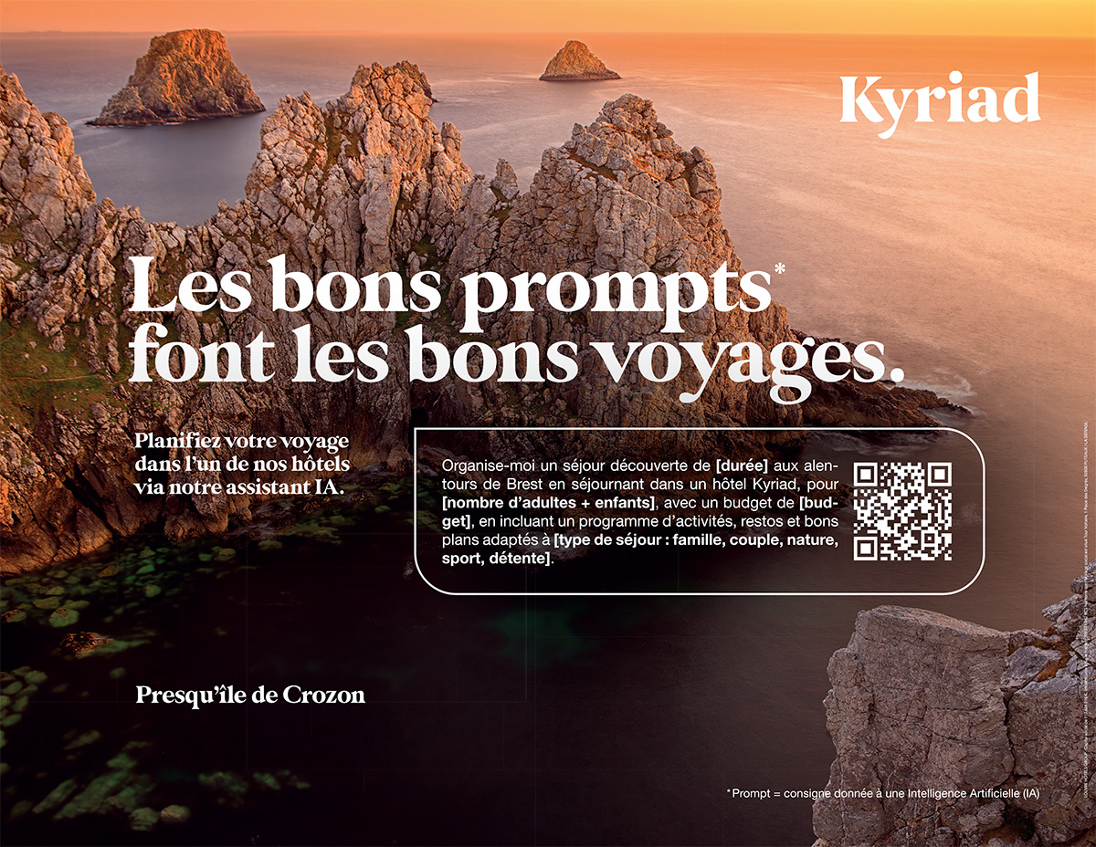 Face à cette réalité, et dans un contexte où les usages technologiques évoluent à une vitesse fulgurante, Kyriad (enseigne du Louvre Hotels Group) a décidé de frapper un grand coup. Accompagnée par l’agence créative Change, la marque hôtelière dévoile « Promptez, partez. », une campagne inédite qui fait de l’Intelligence Artificielle le nouveau point de départ incontournable de vos prochains séjours.