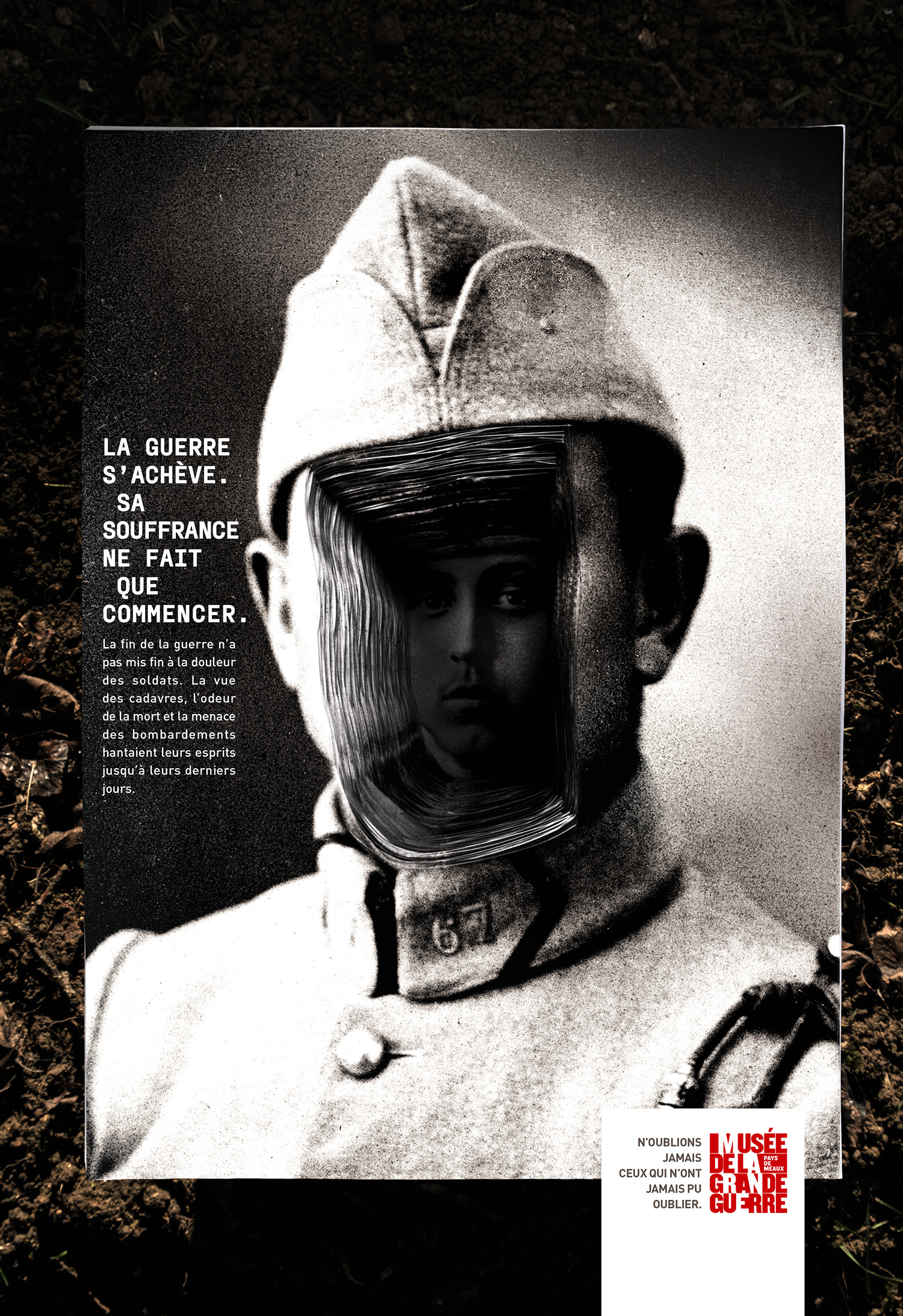 Le génie de cette campagne réside dans son processus de fabrication, décrit comme volontairement lent, physique et expérimental. Le directeur artistique Julien Beuvry et ses équipes ont fait subir aux affiches des traumatismes réels, refusant la facilité de l’usage d’images générées par IA. Chaque visuel est une mise en abyme vertigineuse de l’enfer des tranchées.