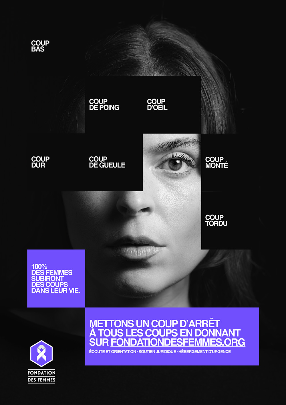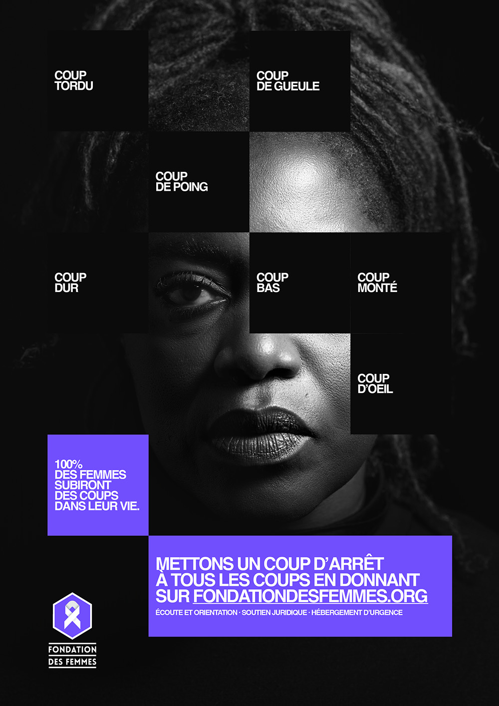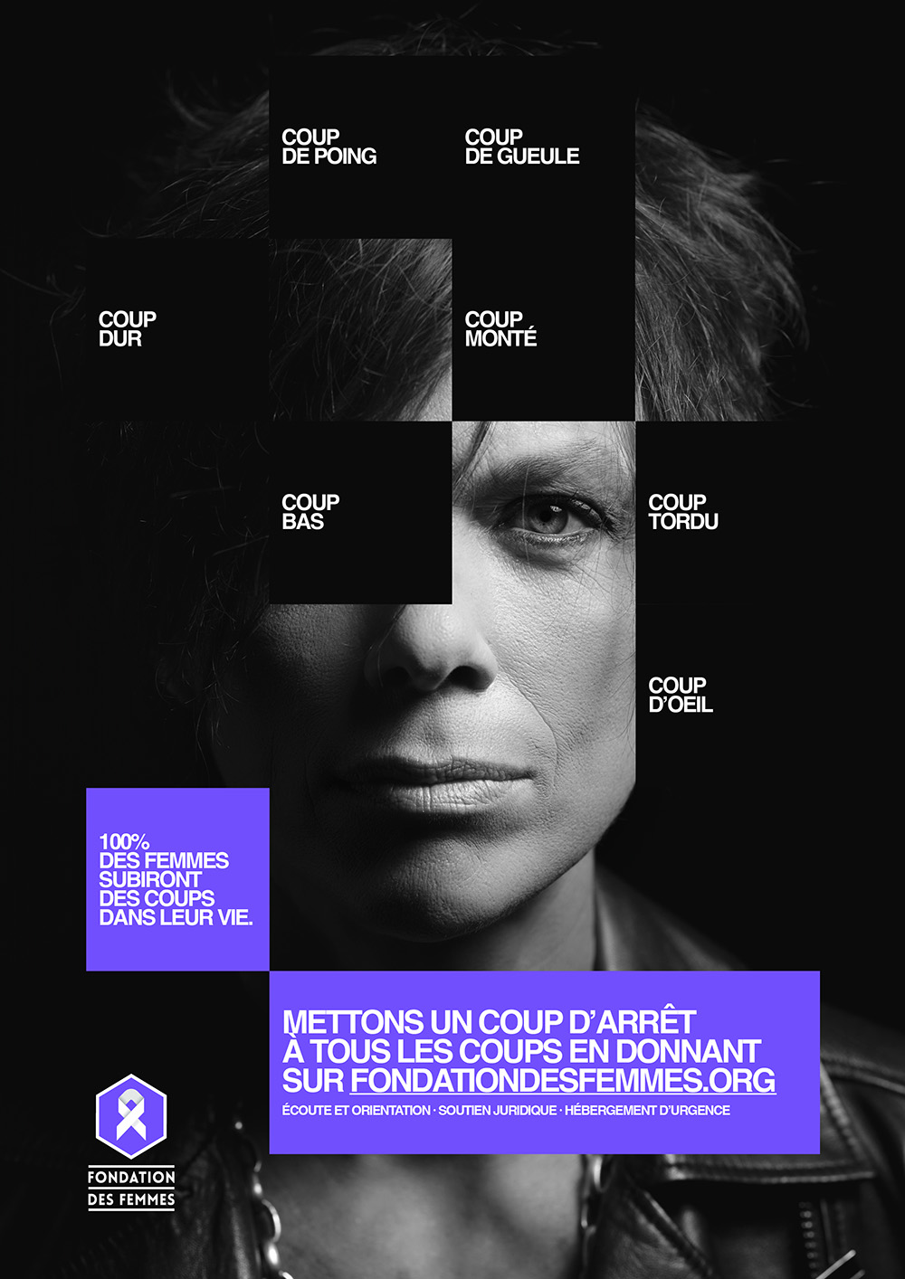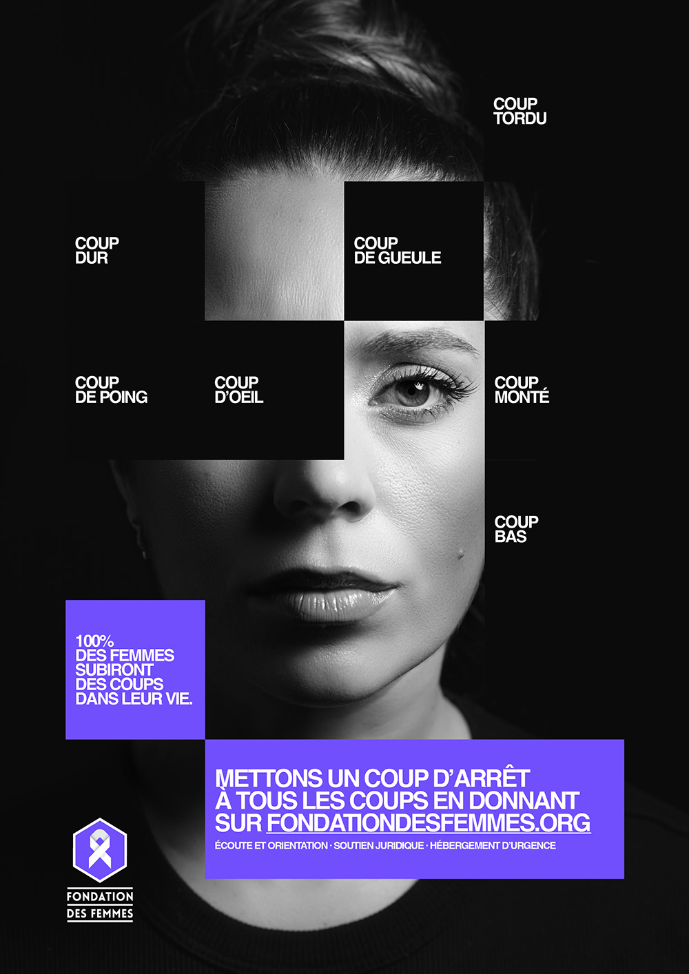 En parallèle du film, la campagne se décline en affichage, presse et DOOH avec une idée visuelle marquante. Les Gros Mots imaginent une représentation graphique où chaque coup devient un morceau de soi qui disparaît. Cette métaphore, à la fois simple et brutale, renvoie à la manière dont les violences grignotent l’identité des femmes, parfois sans qu’elles en aient pleinement conscience.