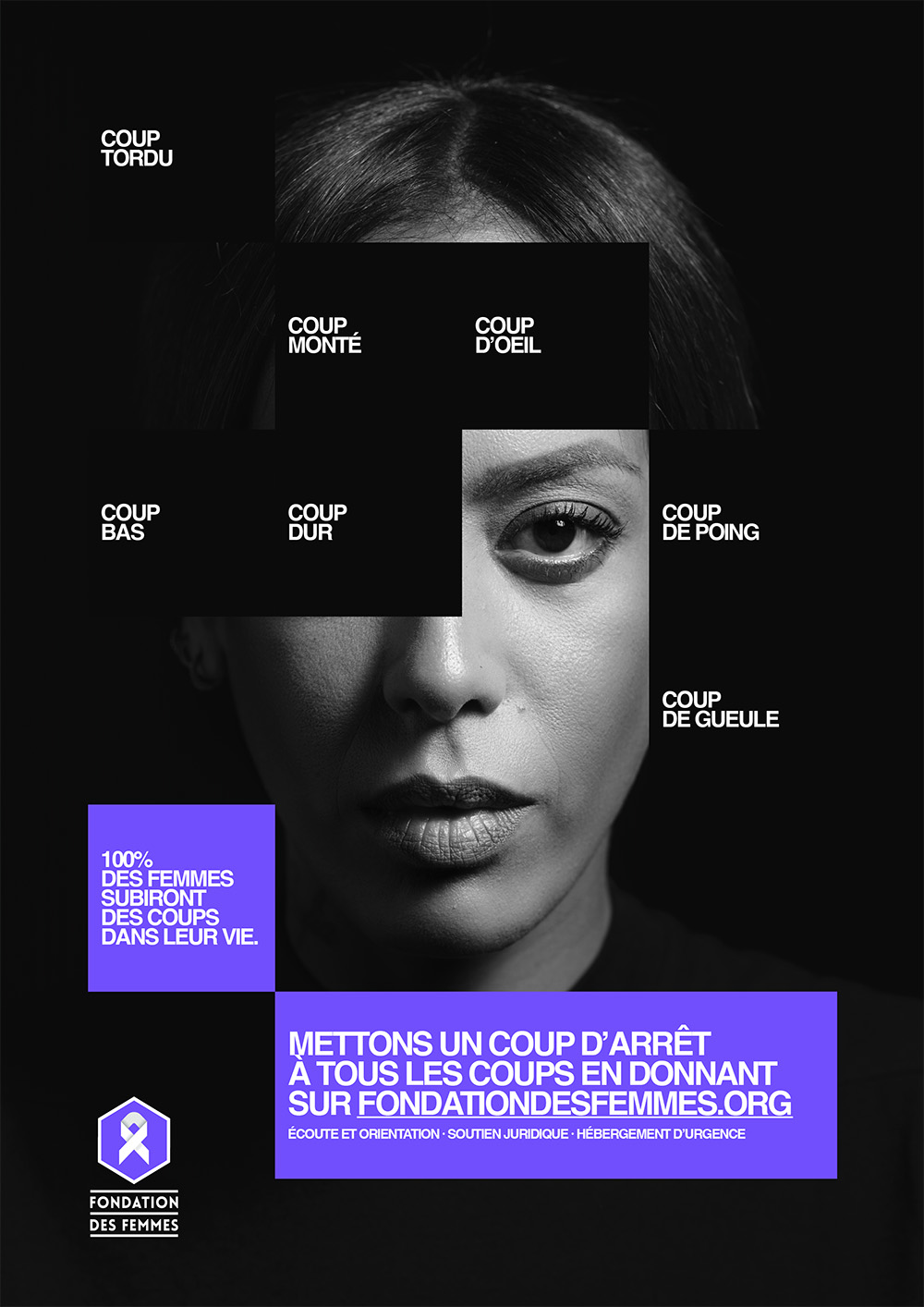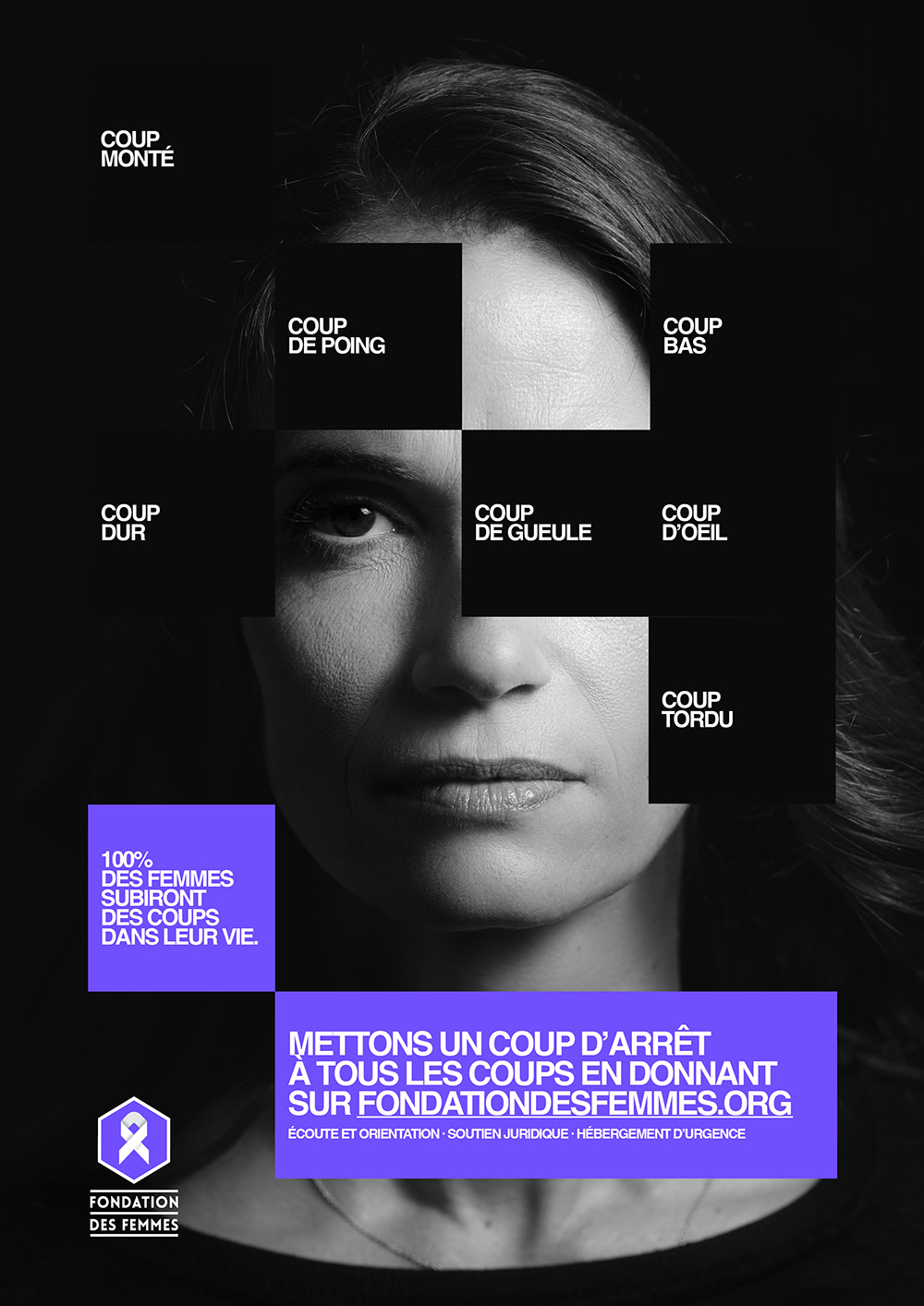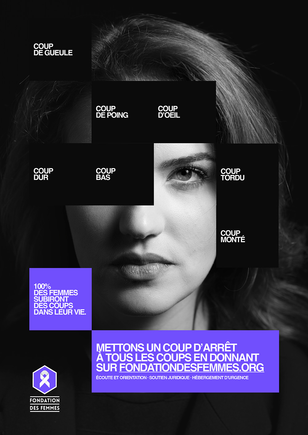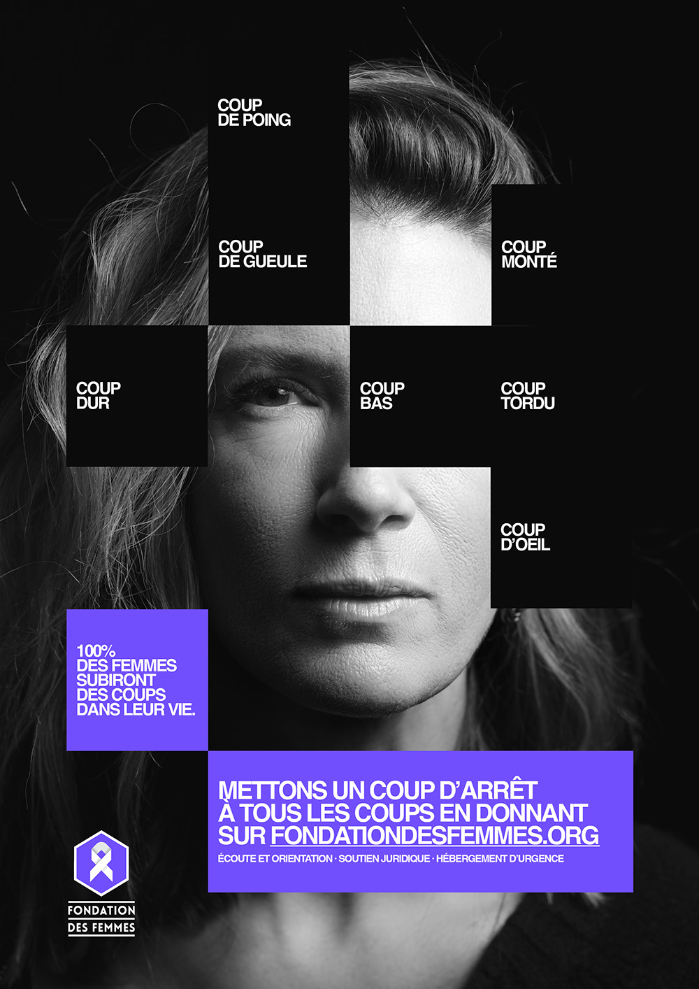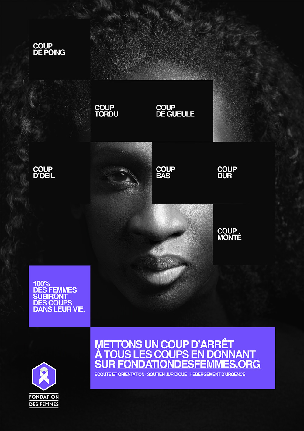 En parallèle du film, la campagne se décline en affichage, presse et DOOH avec une idée visuelle marquante. Les Gros Mots imaginent une représentation graphique où chaque coup devient un morceau de soi qui disparaît. Cette métaphore, à la fois simple et brutale, renvoie à la manière dont les violences grignotent l’identité des femmes, parfois sans qu’elles en aient pleinement conscience.