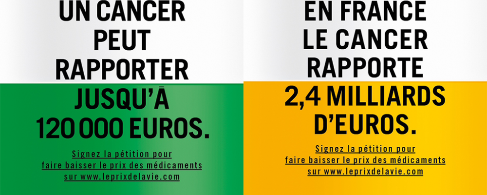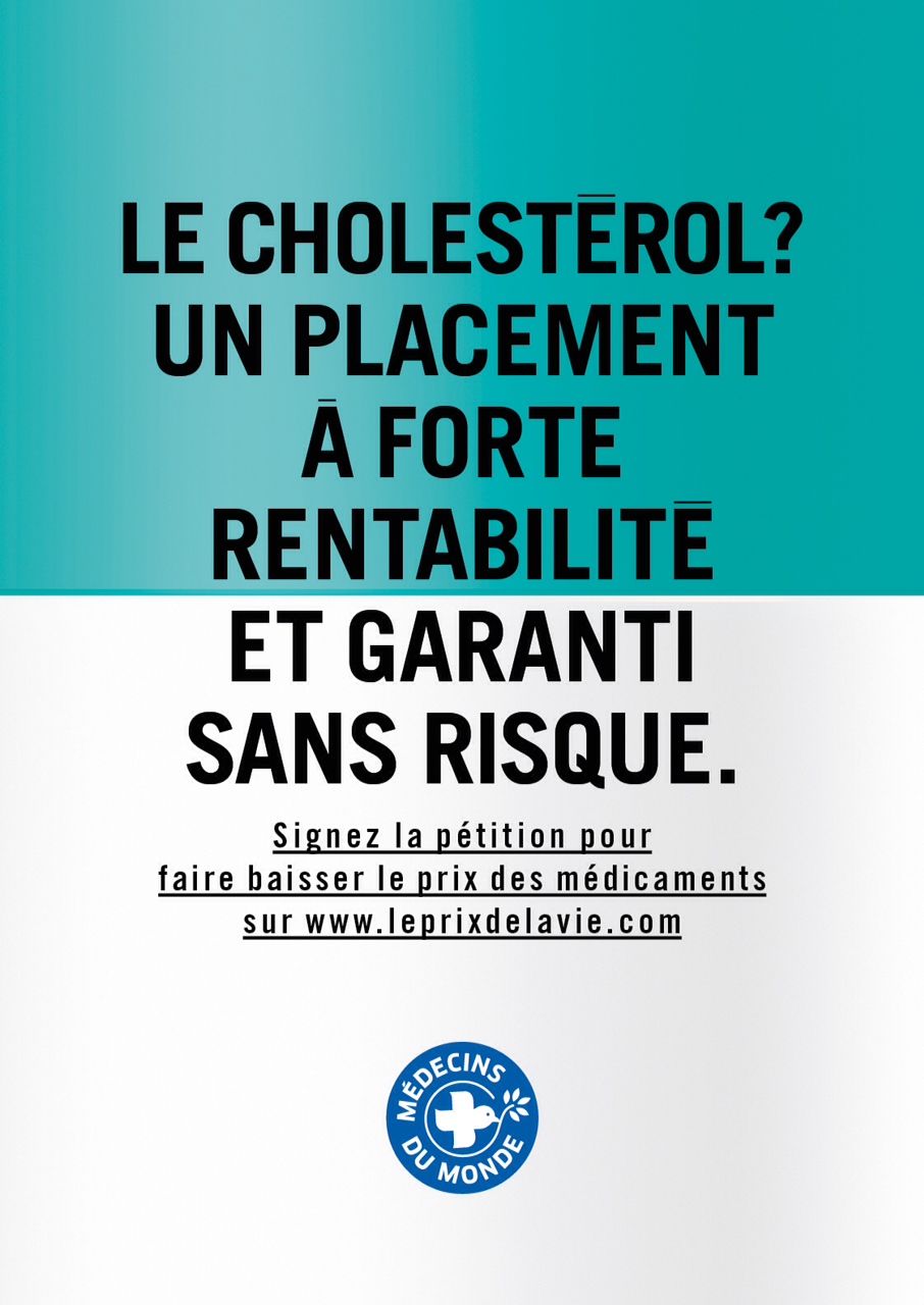 Médecins du Monde a décidé de jeter un pavé dans la marre en dénonçant haut et fort ces pratiques afin de mobiliser l’opinion publique et faire réagir le gouvernement pour qu’il joue son rôle de législateur. Un pavé sous forme d’affiches. 10 affiches typographiques qui prennent le sujet sous l’angle saisissant de la rentabilité des maladies.