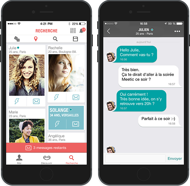 - « Découvrir » : symbolisé du double « e » de Meetic, cette fonctionnalité présente les profils en ligne au moment où l’utilisateur se connecte.