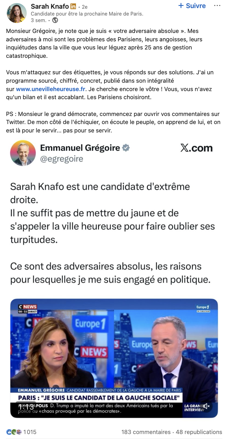 À Paris, cette mutation est évidente. Sarah Knafo utilise abondamment la plateforme pour tacler les sorties d’Emmanuel Grégoire, candidat de l’union de la gauche, qui de son côté préfère encore réserver ses piques à X. Ce glissement des usages prouve que les candidats cherchent désormais à politiser l’audience cadre et dirigeante là où elle passe son temps de cerveau disponible.