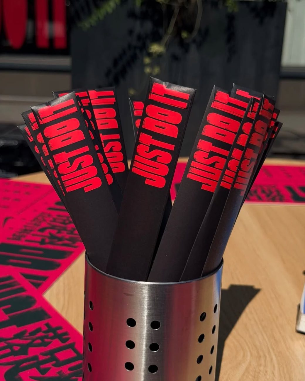 Le génie de l’opération réside dans son design. Les photos qui circulent sur les réseaux sociaux montrent un espace minimaliste qui reprend les codes de la « street food » locale : des taburetes en plastique rouge typiques, des tables simples et une ambiance de quartier. Mais le branding est omniprésent et subtil. Les baguettes, les bols et les cuillères sont griffés aux couleurs de Nike.