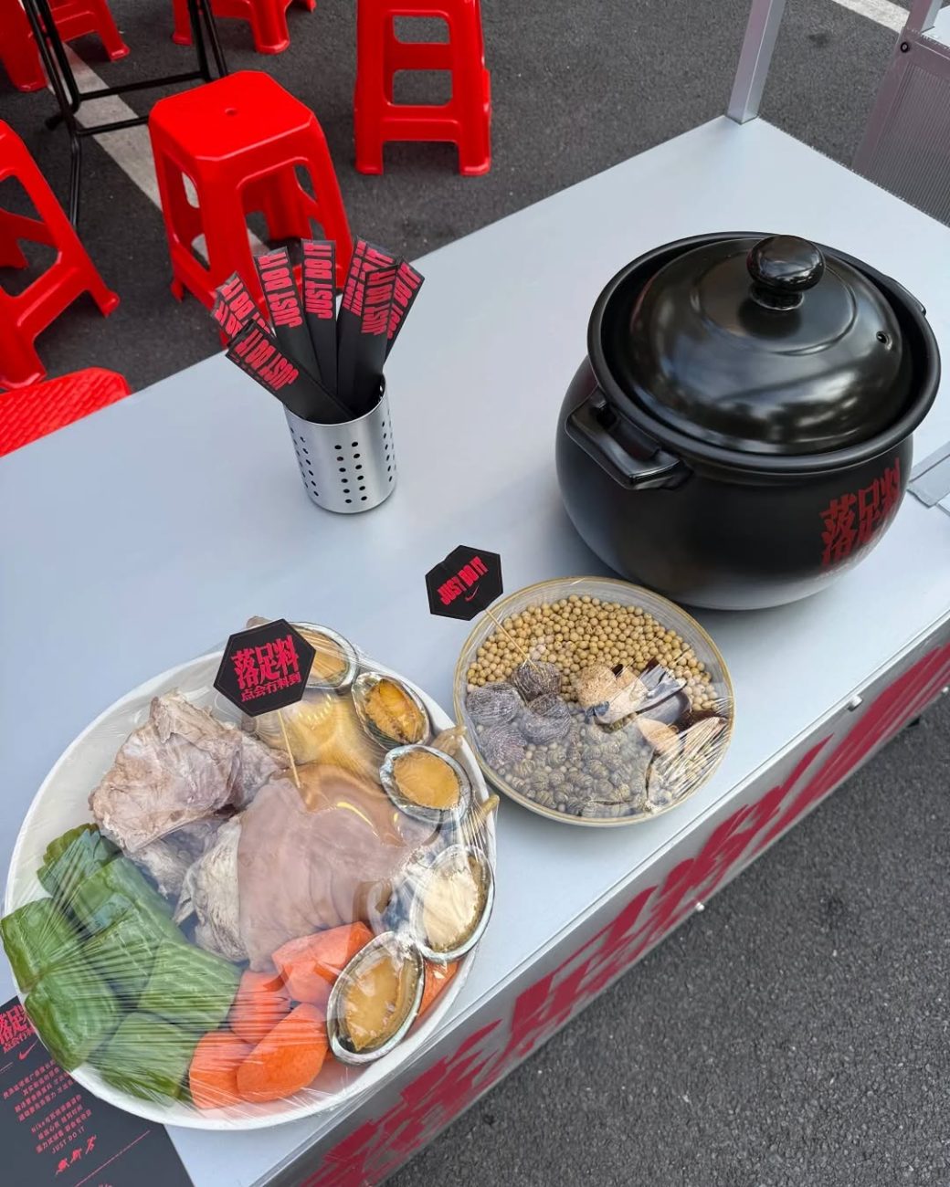 À côté des marmites fumantes, on trouve un espace commercial éclairé aux néons, mettant en scène un mur de sneakers en édition limitée. Le contraste entre l’authenticité culinaire et la « hype » streetwear crée une esthétique visuelle parfaite pour le digital. De plus, Nike a poussé le concept jusqu’au merchandising en proposant des « kits de soupe » brandés (bol, cuillère, baguettes) à emporter. Ce type d’objet collector est le graal pour les fans de la marque.