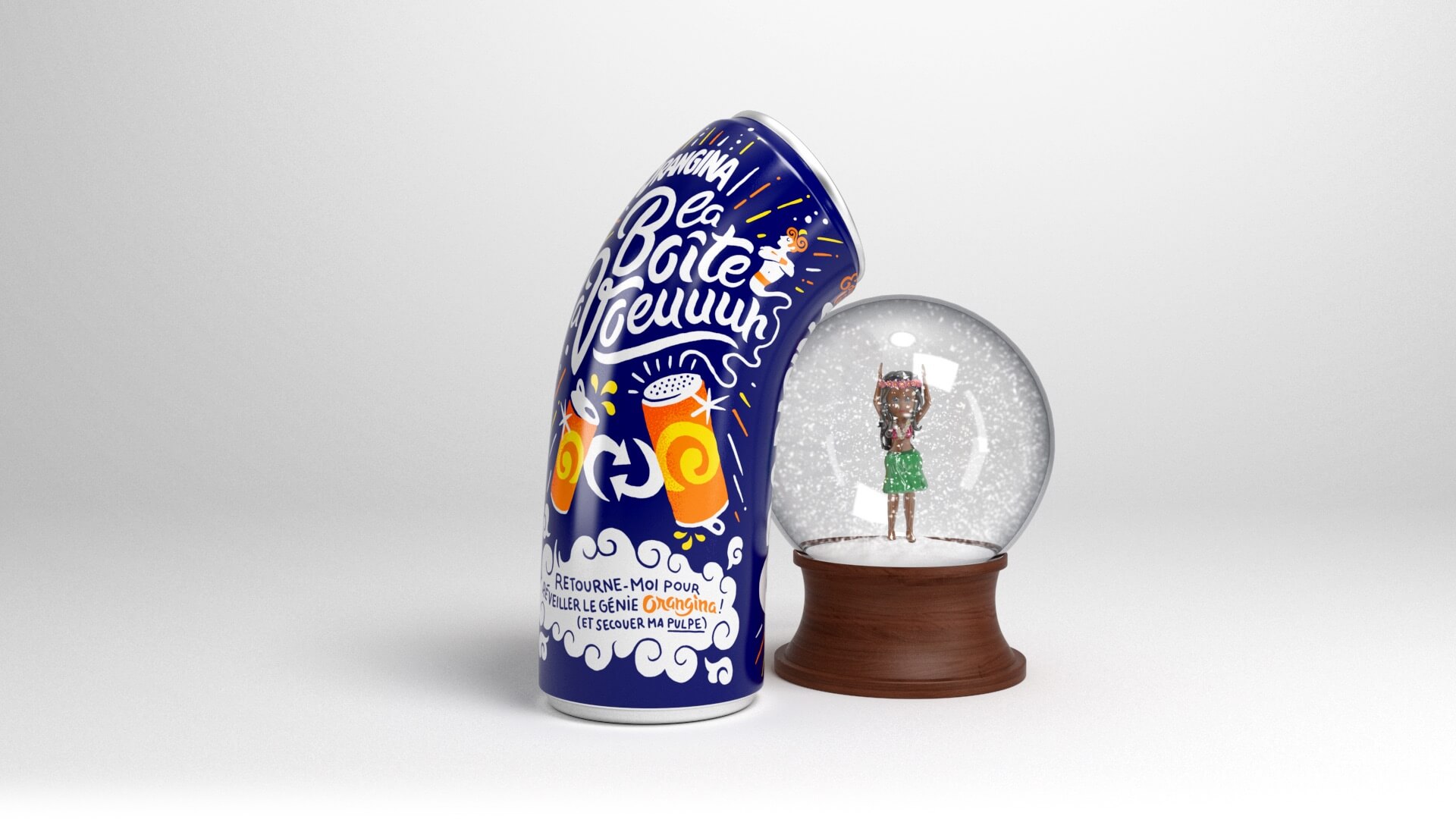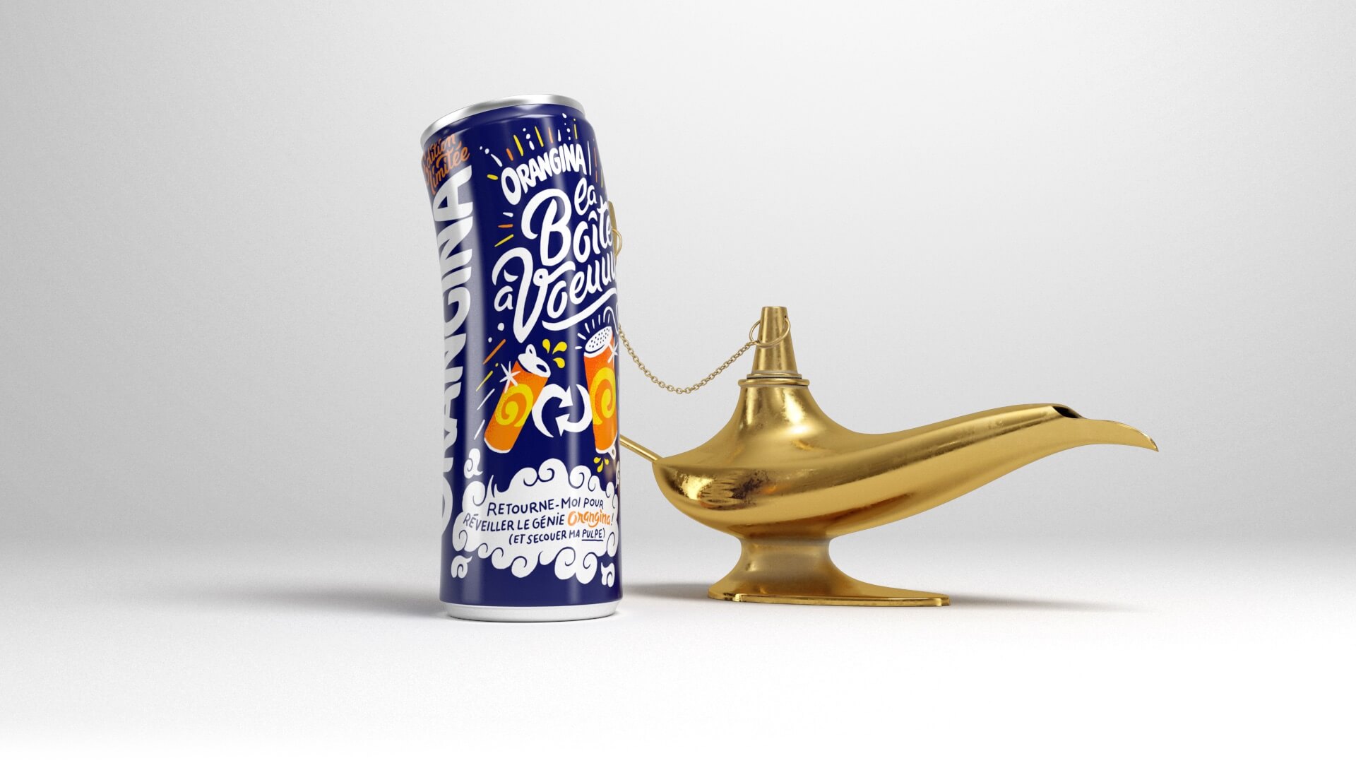 Sur les 20 millions de canettes commercialisées seules 50 000 d’entre elles renferment Le Génie Orangina qui nous parle quand on le retourne. Alors trouvez-le en retournant un maximum de canettes et rentrez le code inscrit sous la canette sur laboiteavoeuuuh.fr pour ensuite formuler votre voeu.