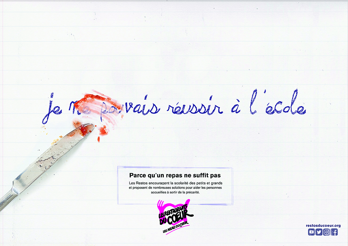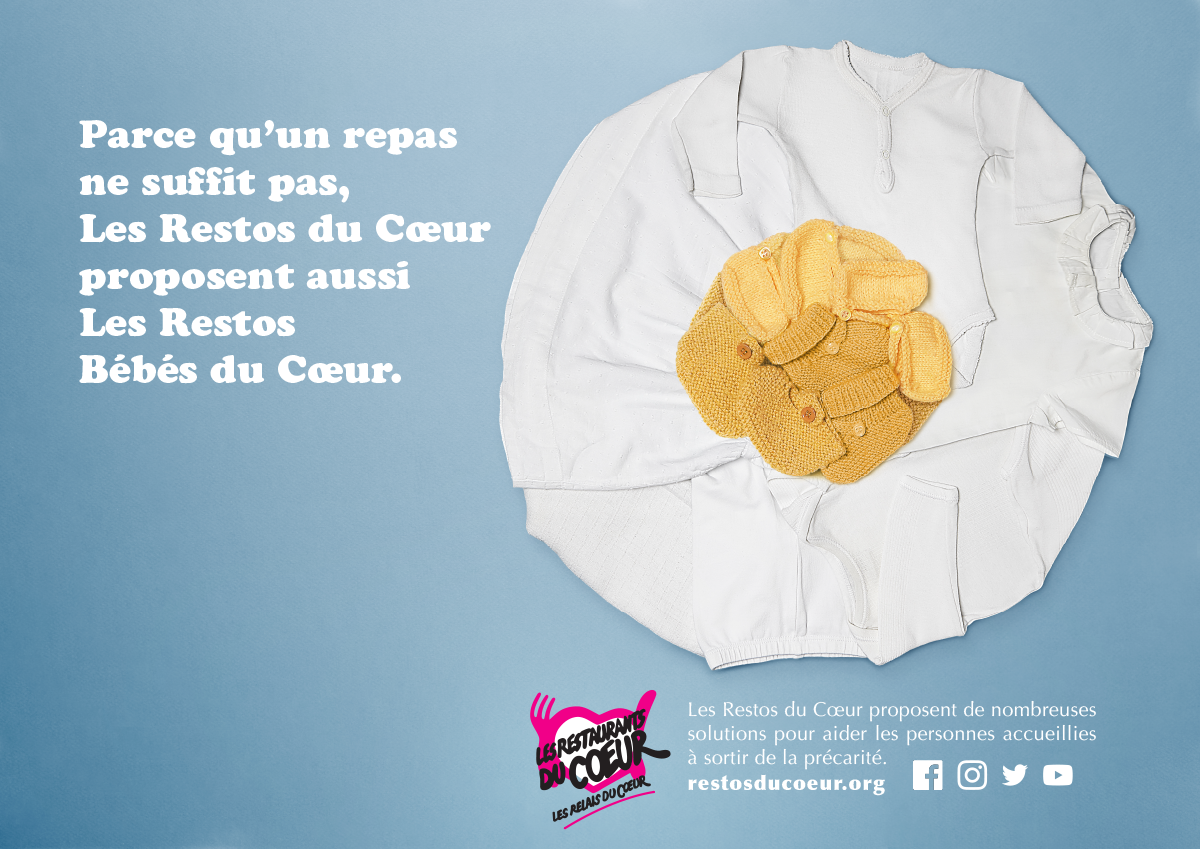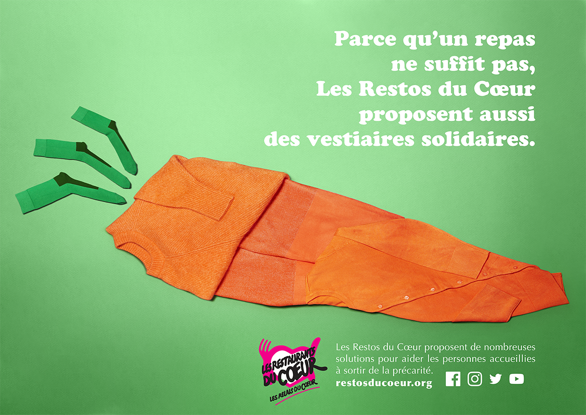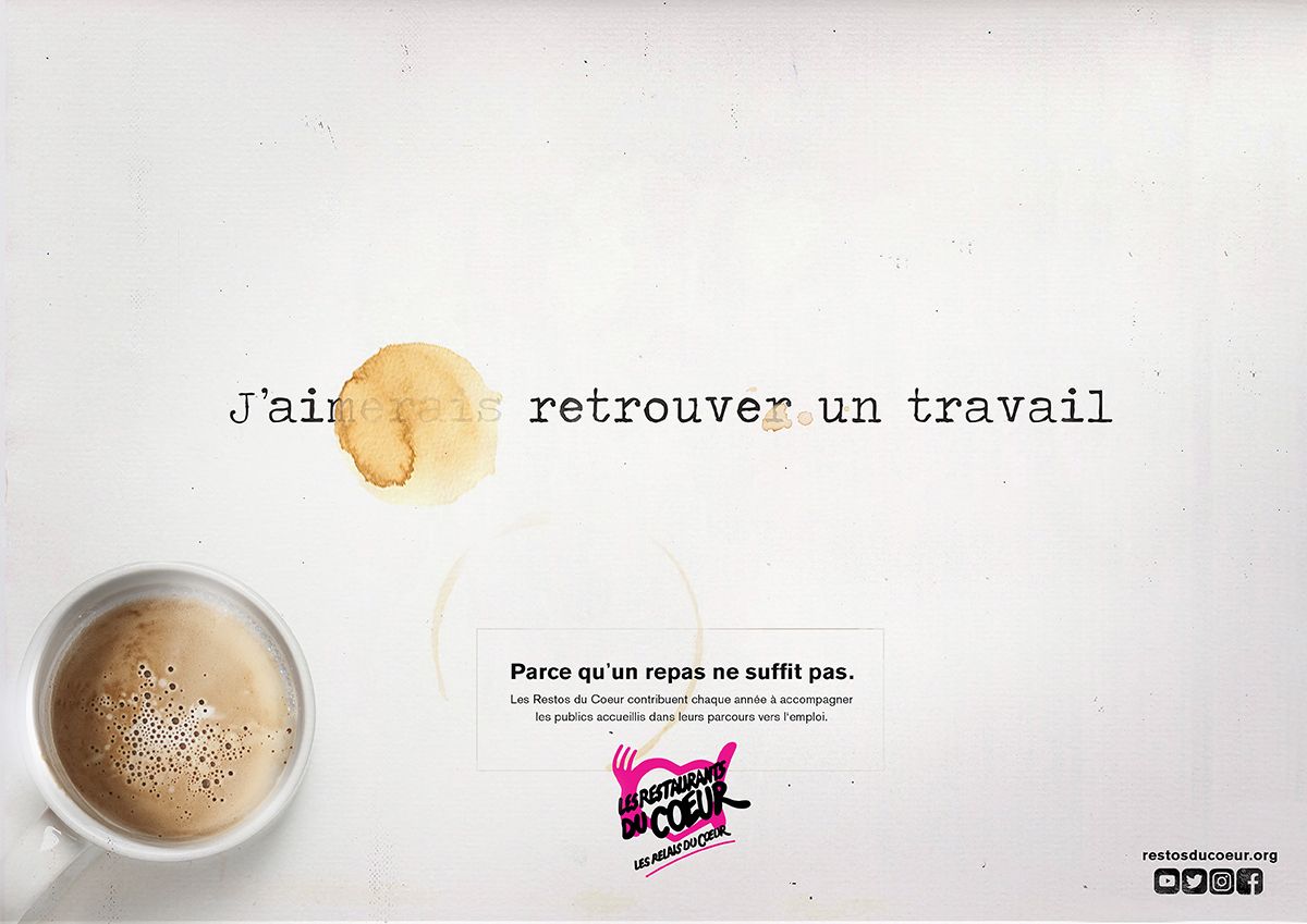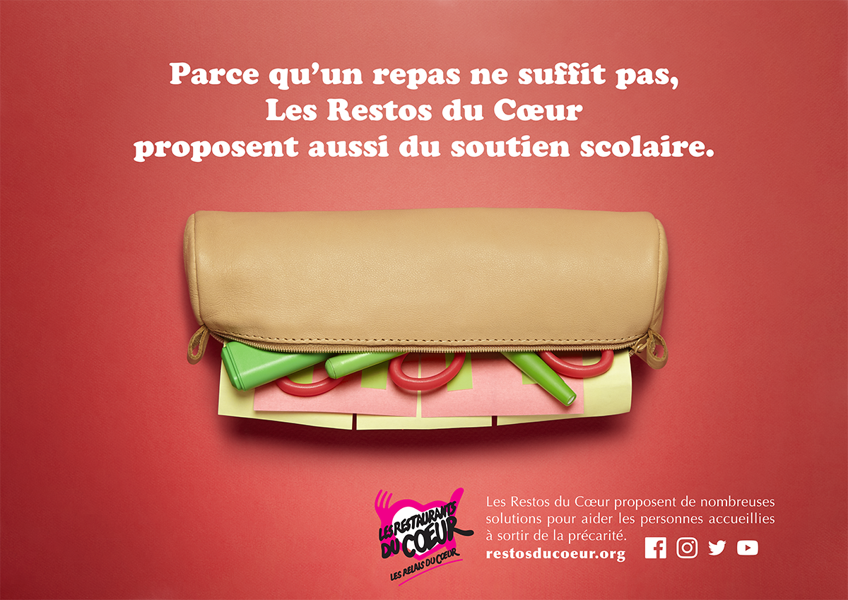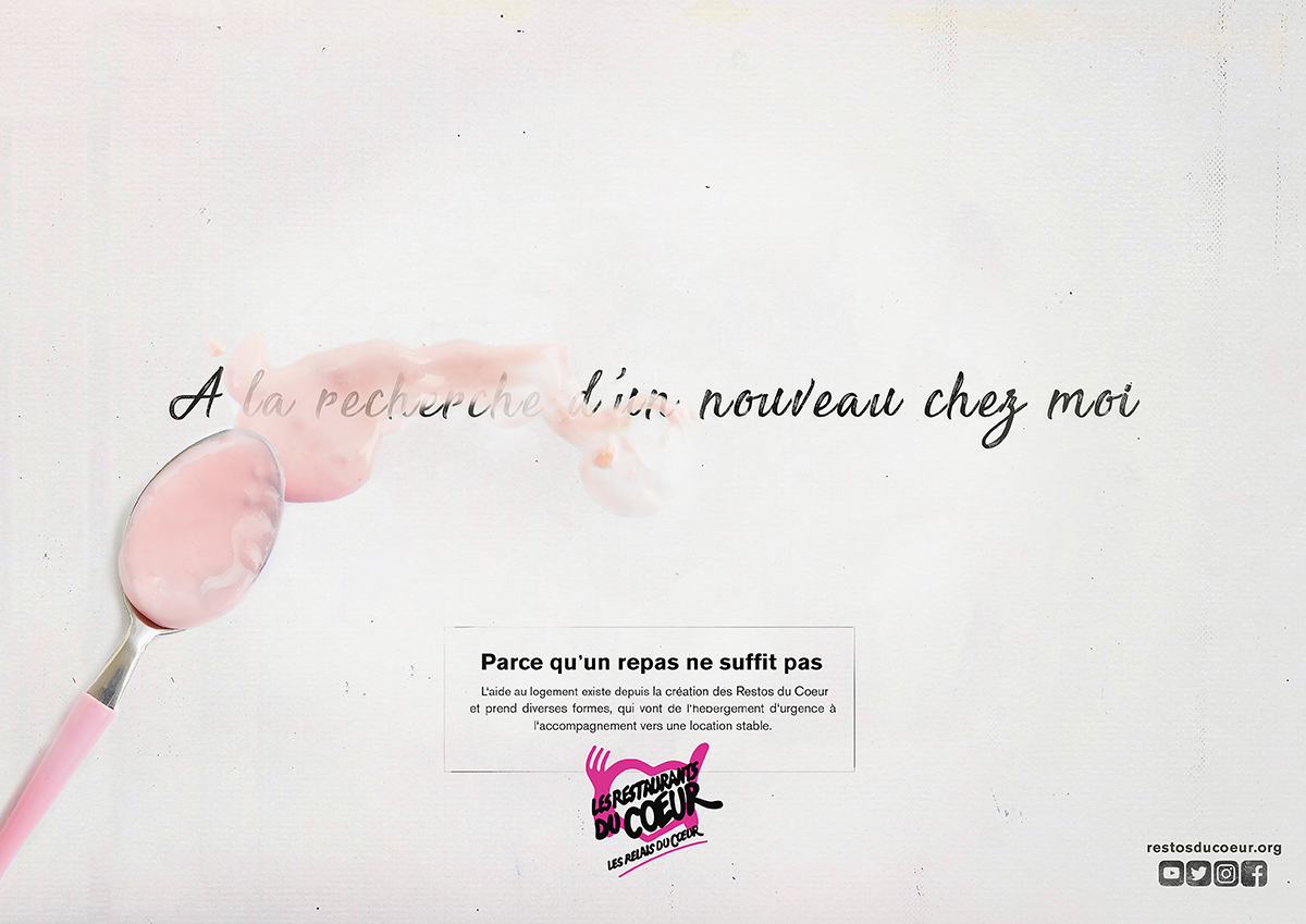 Cette année, l’idée était de créer une campagne pour les Restos du Coeur. En plus d’avoir toujours besoin de gagner en visibilité, l’ONG avait aussi besoin de présenter ses autres métiers. Car même si le nom et le logo font clairement penser à un repas solidaire, l’association propose aussi des aides au logement, des aides scolaires, des aides pour trouver un travail, etc. Autant de métiers inconnus du grand public qu’il fallait mettre en lumière. Un brief pas évident donc, qu’il fallait aborder avec délicatesse et créativité.