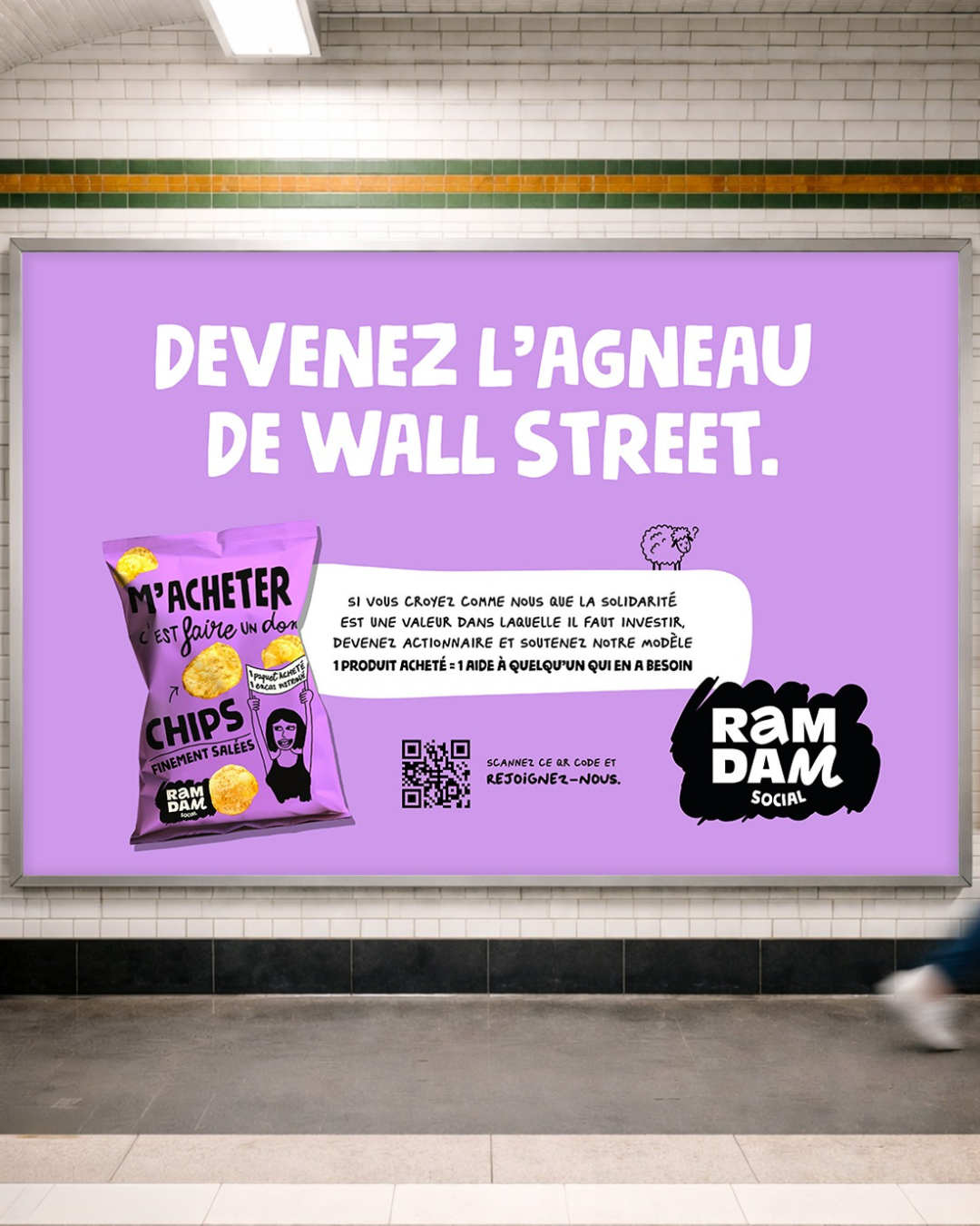 Pour marquer les esprits des usagers du métro, Ramdam Social a choisi le décalage. En troquant le loup pour l’agneau, l’entreprise à mission souligne sa volonté de construire un modèle d’investissement plus collectif et humain. Le message est limpide : ici, on ne cherche pas la spéculation sauvage, mais le financement d’un modèle redistributif.