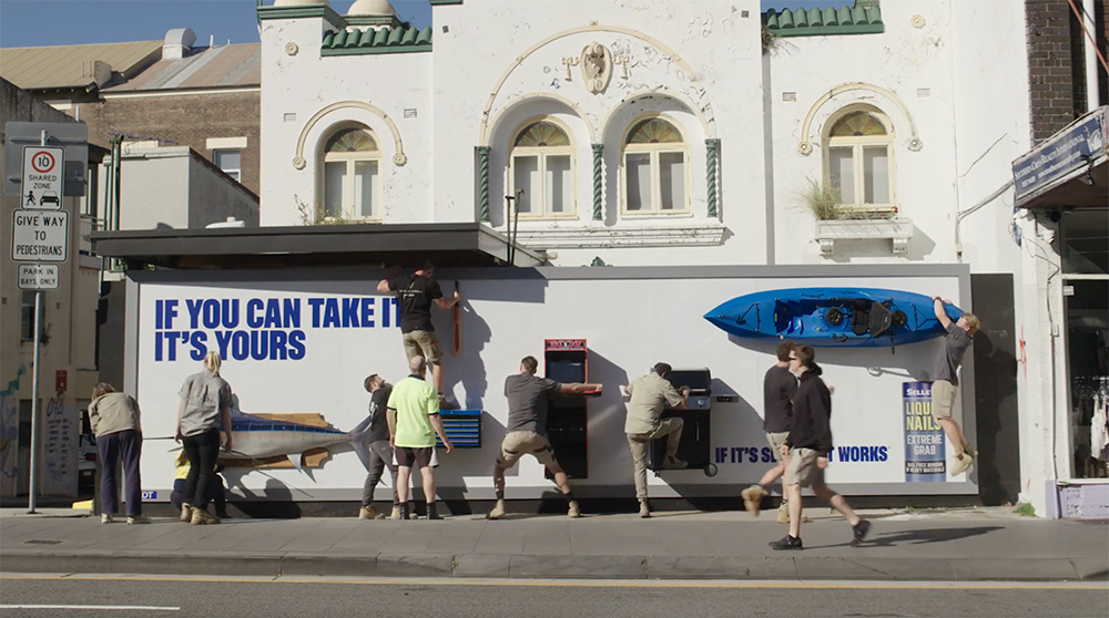 L’idée de départ est aussi simple que brillante : prouver la force de l’adhésif Liquid Nails non pas avec des chiffres ou des comparaisons, mais avec un défi physique grandeur nature. Dans les rues d’Australie, Selleys a fixé tout un tas d’objets à un mur géant, du kayak à la machine d’arcade, et a invité quiconque à venir tenter de les arracher.