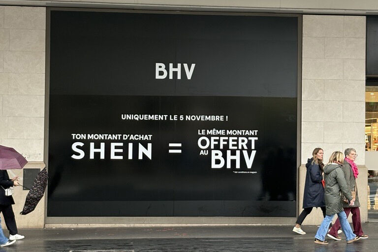 Face à cette avalanche de critiques en ligne, la stratégie de communication du BHV Marais a été pour le moins prudente. Officiellement, le grand magasin est resté silencieux sur ses réseaux sociaux : aucune publication pour annoncer l’arrivée de Shein, pas un mot sur Facebook ou Instagram à ce sujet. La seule communication visible côté BHV s’est limitée à sa vitrine physique, rue de Rivoli, où trônait une énorme affiche annonçant l’ouverture prochaine.