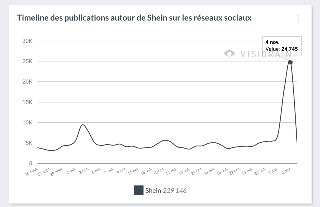 Un second pic de bad buzz a été enregistré le 4 novembre, avec près de 25 000 publications en une seule journée à propos de Shein. Instagram s’est imposé comme le principal terrain d’expression de cette colère planétaire, devant X (Twitter) et LinkedIn.