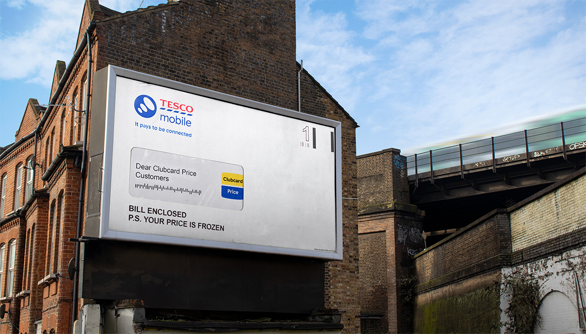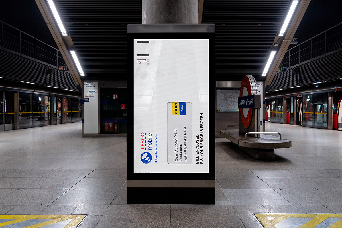 Cependant, le message caché à l’intérieur n’est pas une demande de recouvrement. C’est l’annonce officielle d’un gel des prix exclusif pour les utilisateurs de la Clubcard. L’opérateur renverse ainsi la situation et transforme le pire symbole de l’inflation en une promesse de stabilité financière. Cette maîtrise de l’espace urbain rappelle d’ailleurs la précédente campagne d’affichage audacieuse de Tesco où BBH London jouait déjà avec la force de son identité visuelle pour imposer son message.