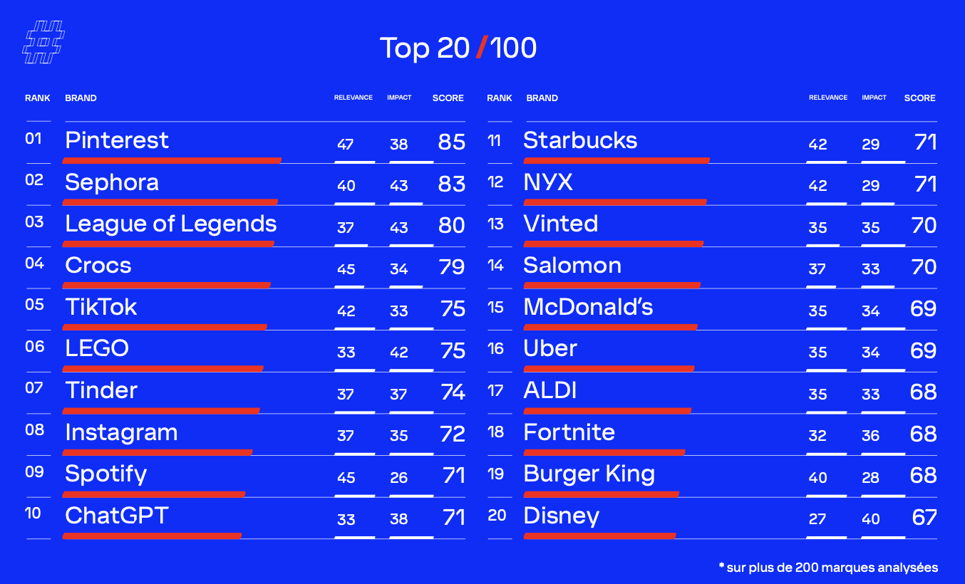 Le résultat ? Un classement des 100 marques les plus vibrantes dont sort grand vainqueur Pinterest. Après 16 ans d’existence, la plateforme réussit l’exploit de rajeunir sa cible. Pourquoi ? Parce qu’elle est perçue comme un espace plus intimiste, utile et personnel, loin de la pression sociale toxique des autres réseaux. Elle ne se contente pas d’émettre du contenu, elle est devenue une « cultural platform » où la culture se crée directement via ses utilisateurs, à l’image de Sephora, Crocs ou encore League of Legends.